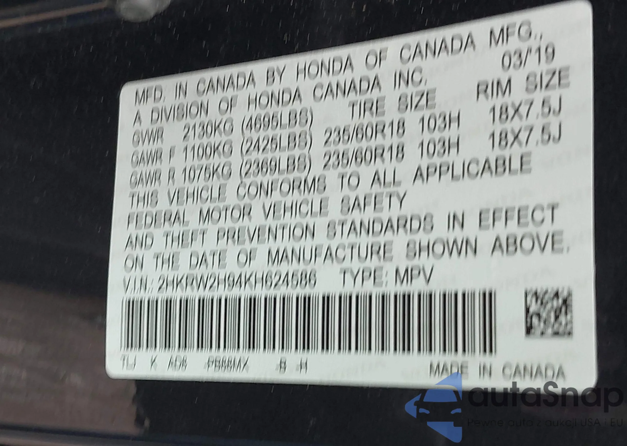 • VIN 2HKRW2H94KH624586