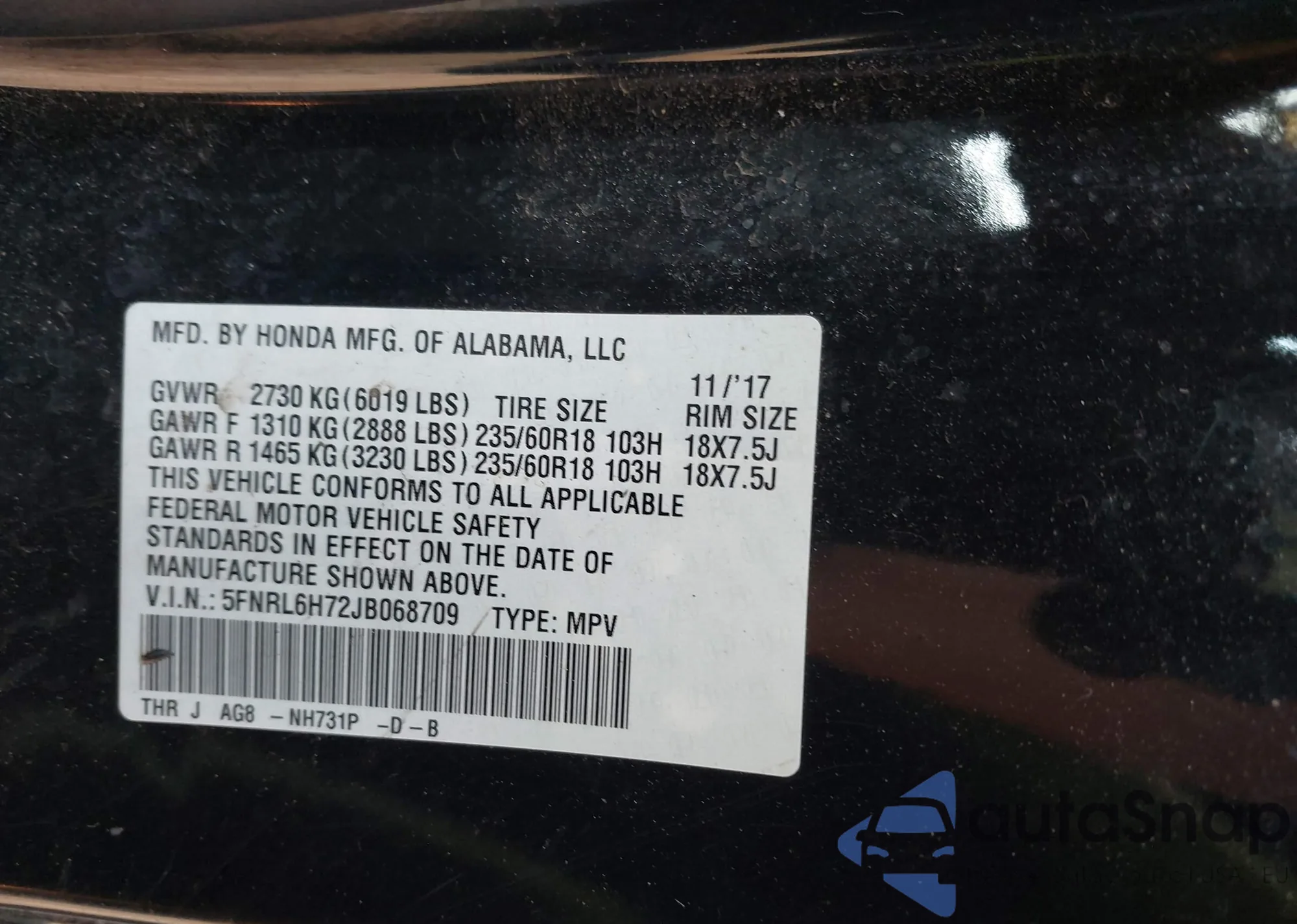 • VIN 5FNRL6H72JB068709