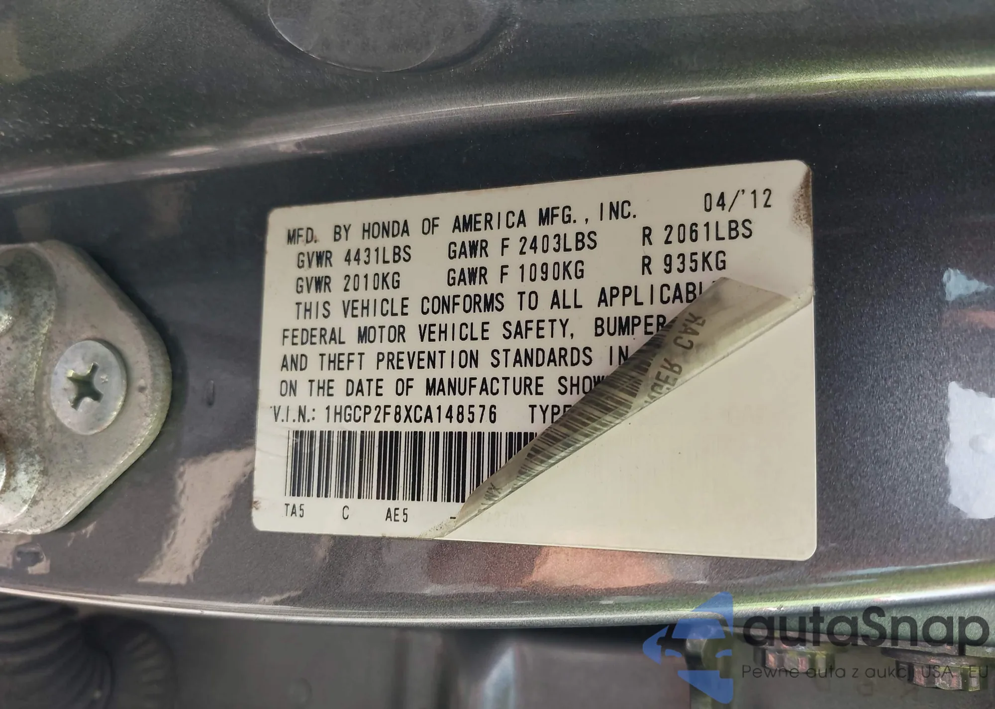 LOT: 42926066 VIN: 1HGCP2F8XCA148576
