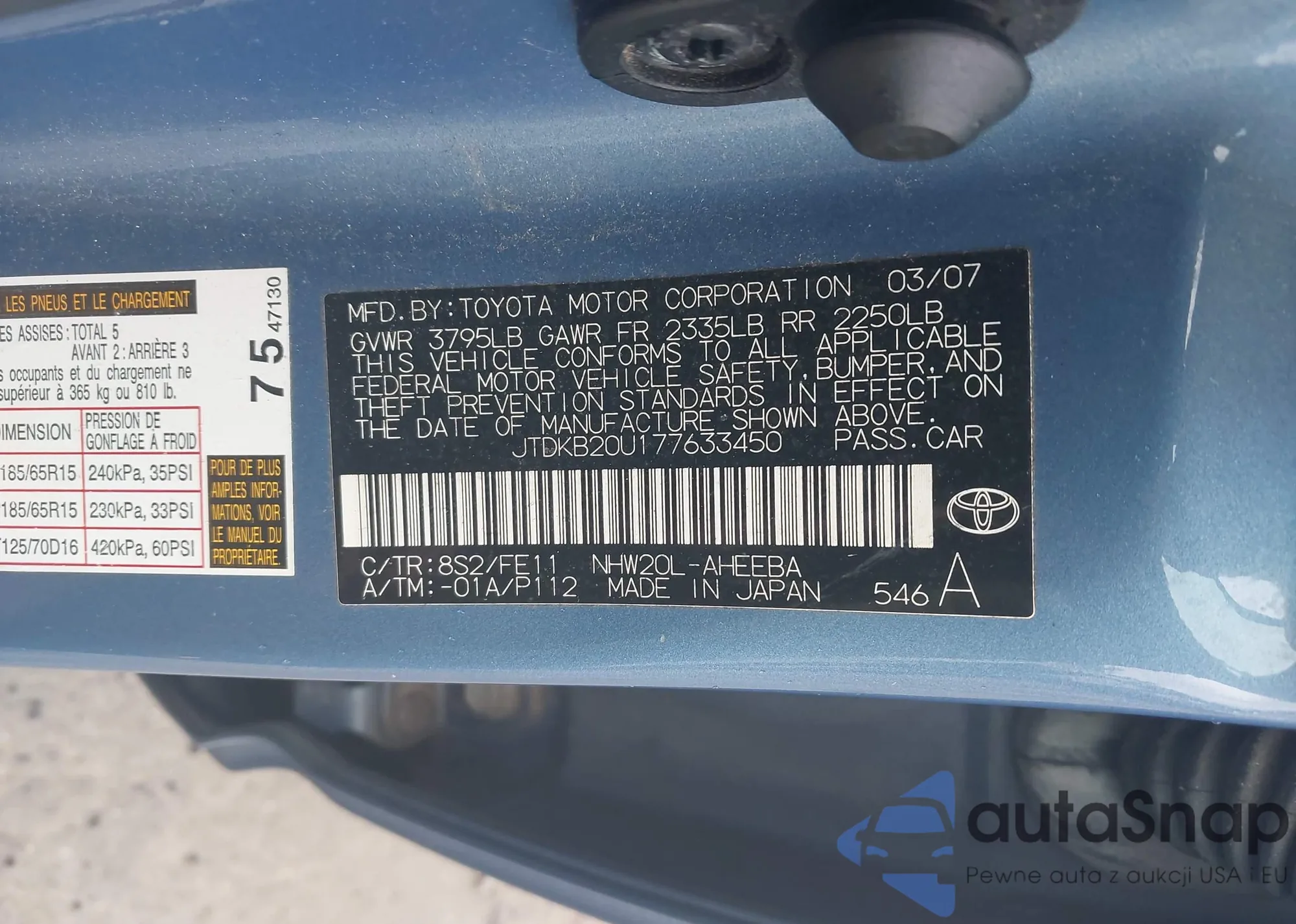 LOT: 43028039 VIN: JTDKB20U177633450