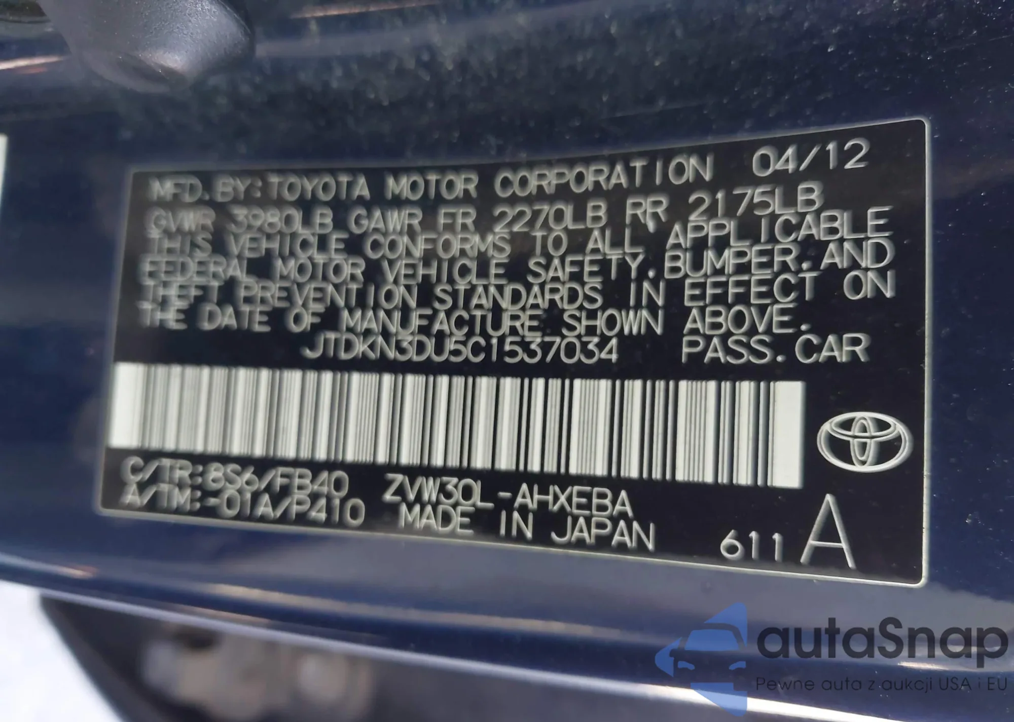 LOT: 43074618 VIN: JTDKN3DU5C1537034
