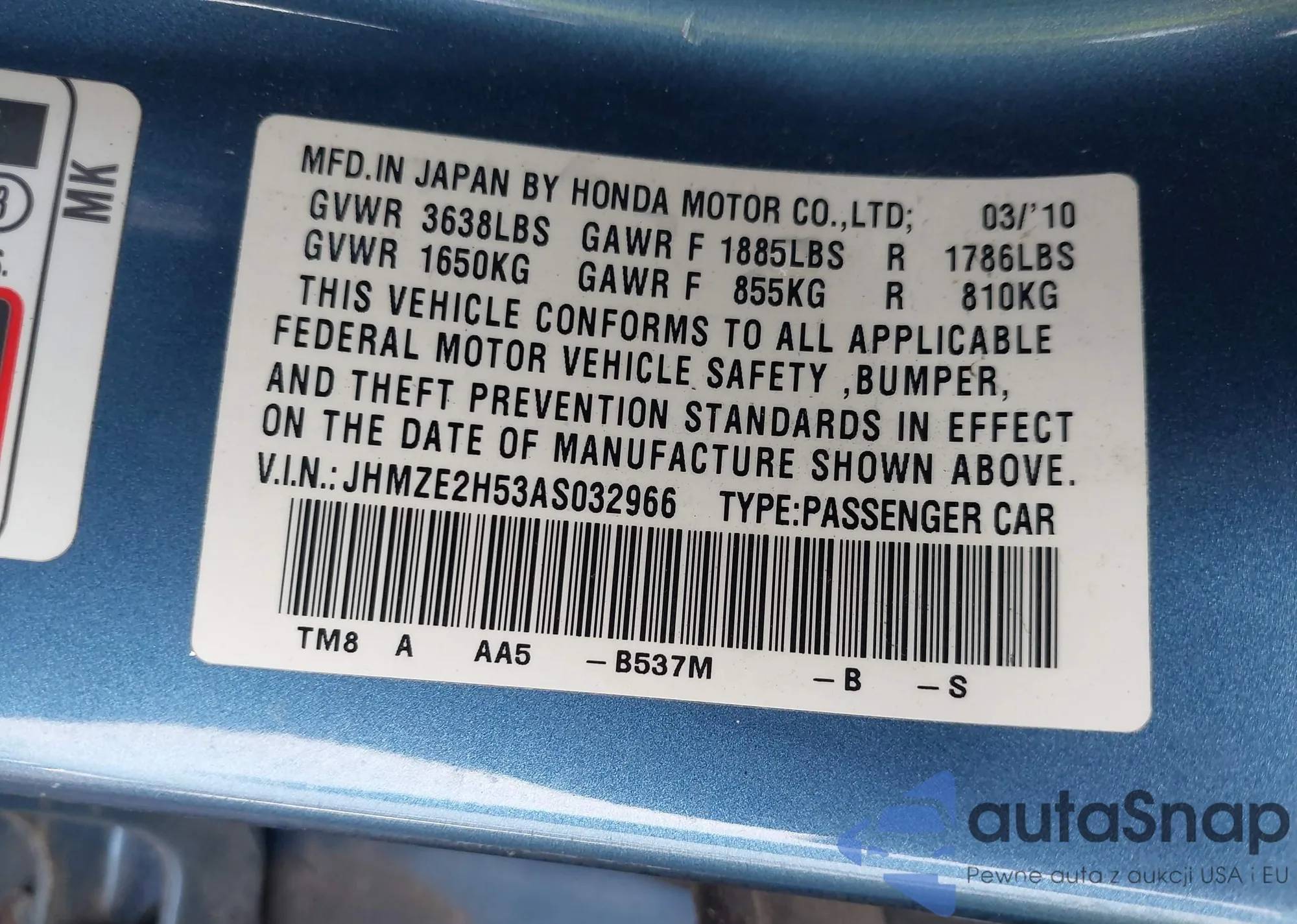 LOT: 42992089 VIN: JHMZE2H53AS032966