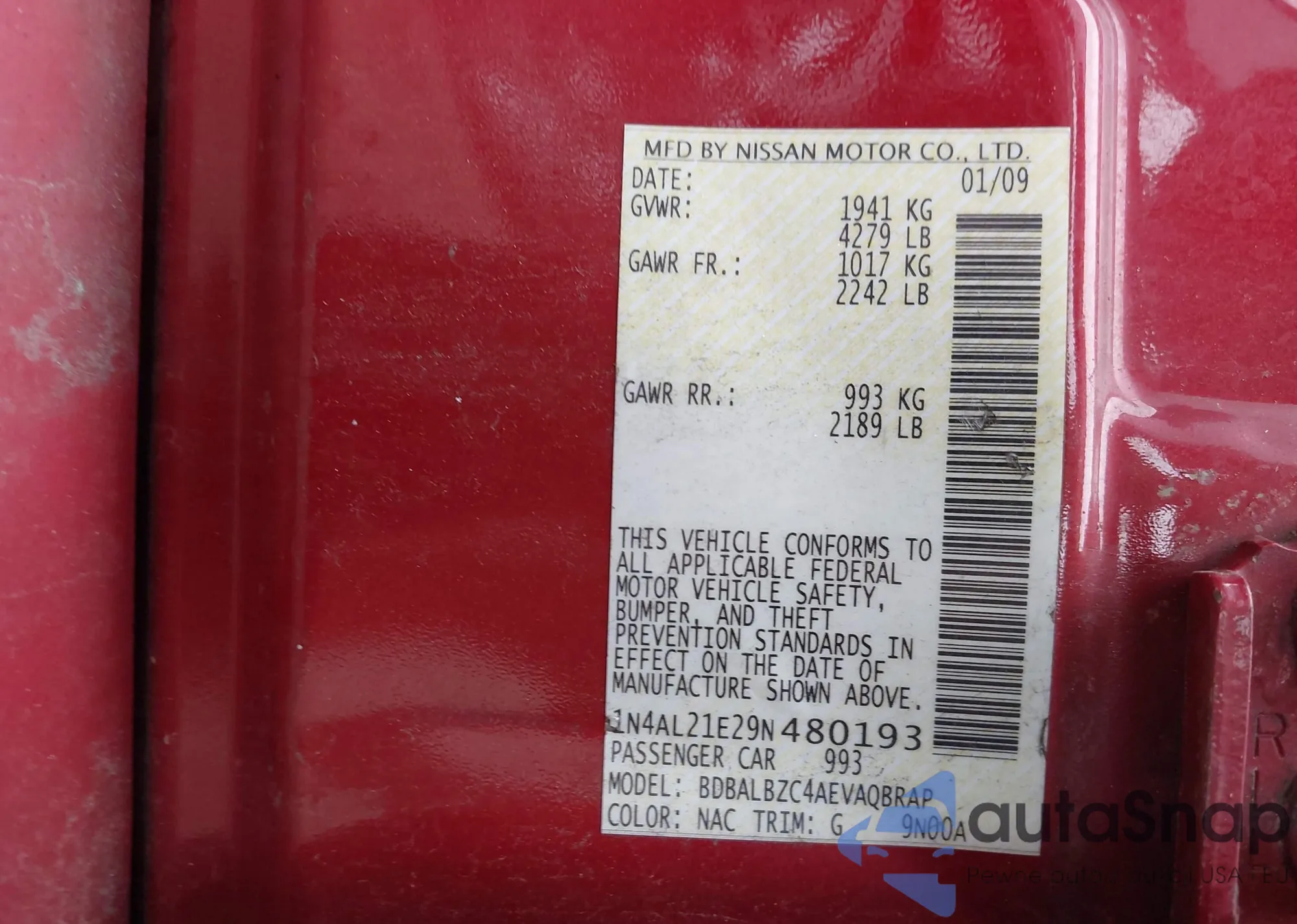 LOT: 43032760 VIN: 1N4AL21E29N480193