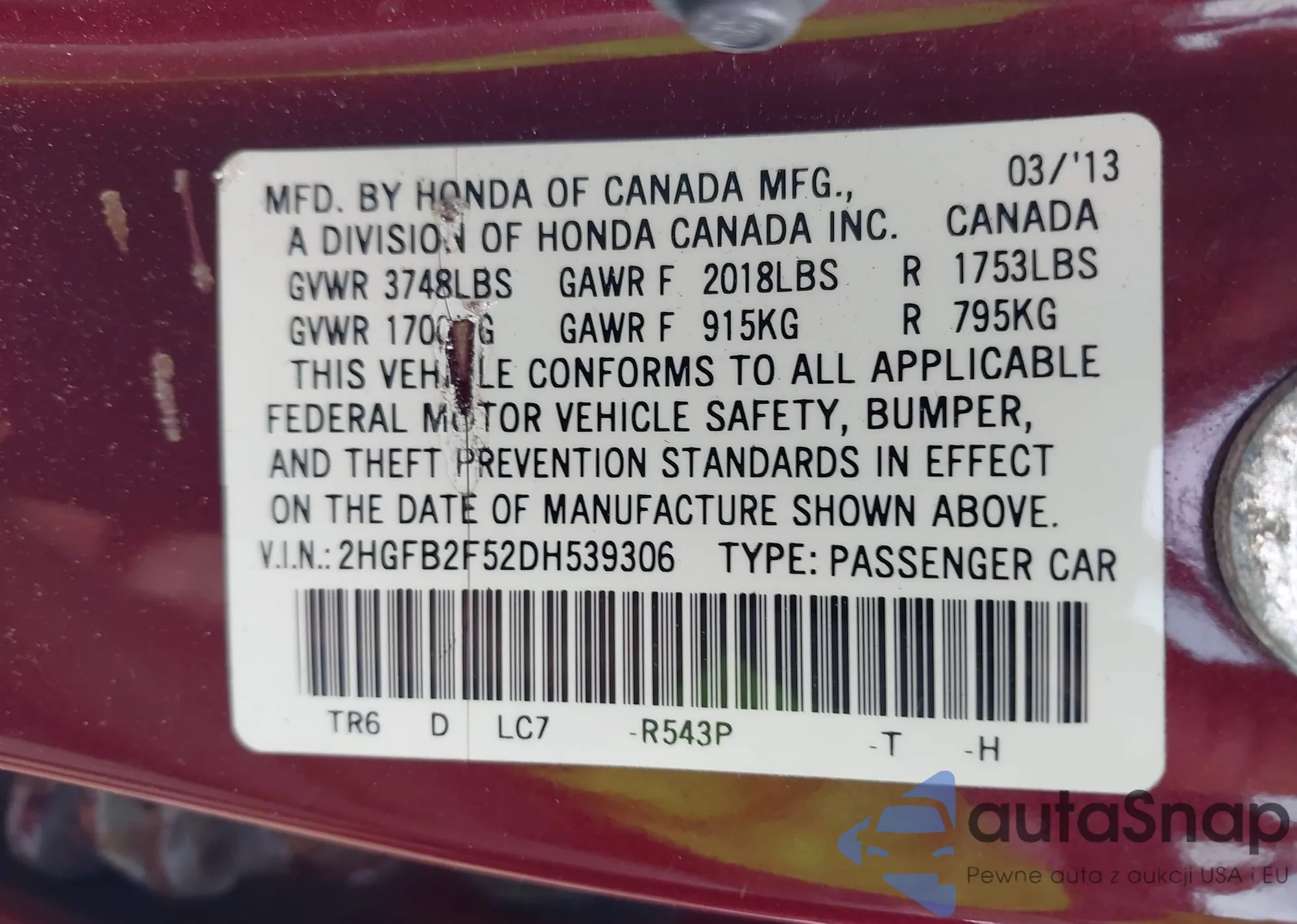 LOT: 42998261 VIN: 2HGFB2F52DH539306