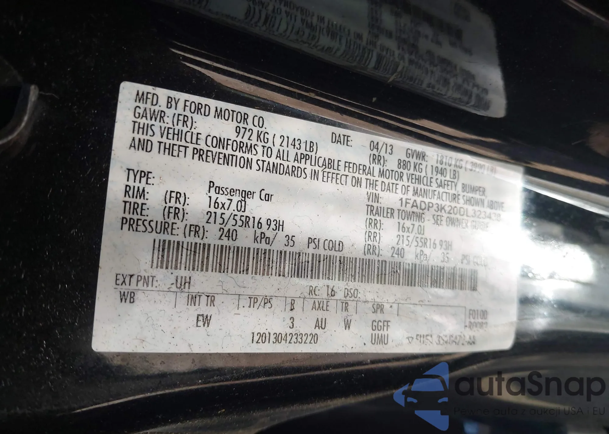 LOT: 43170404 VIN: 1FADP3K20DL323438