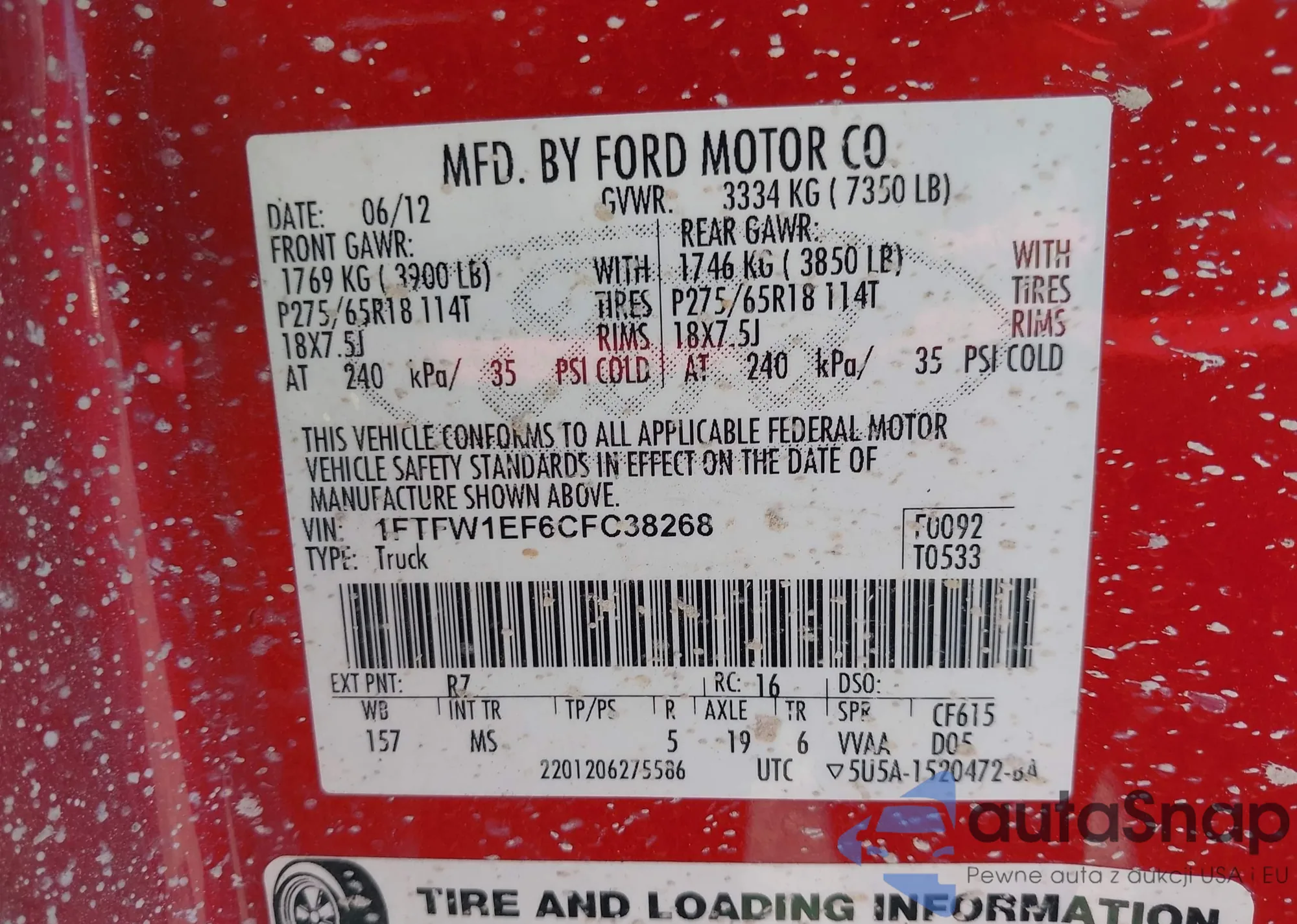 LOT: 43174088 VIN: 1FTFW1EF6CFC38268