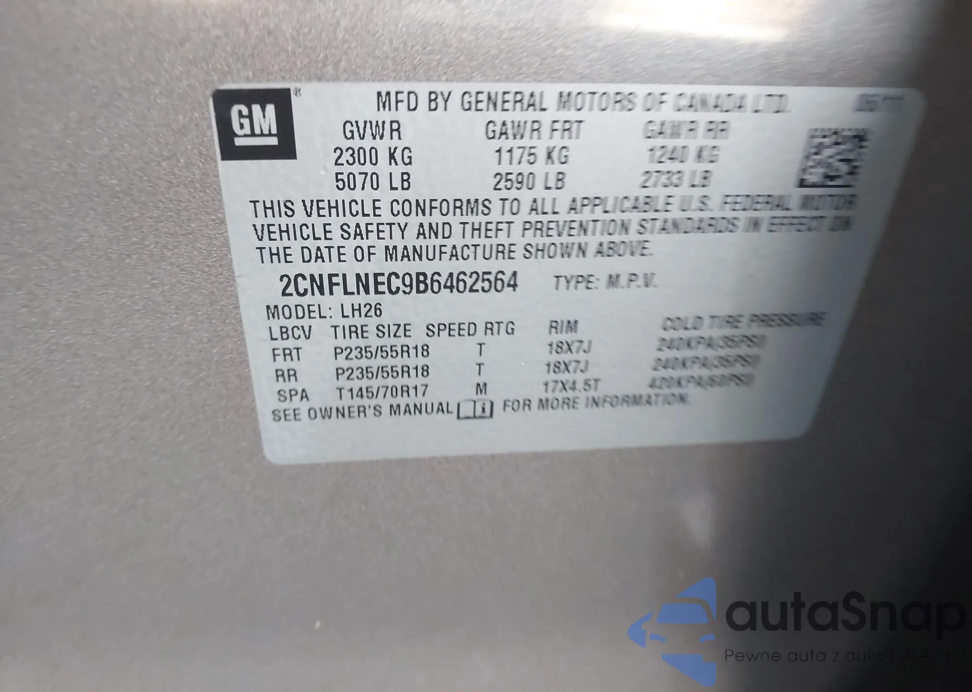 • VIN 5FNRL5H37GB013818