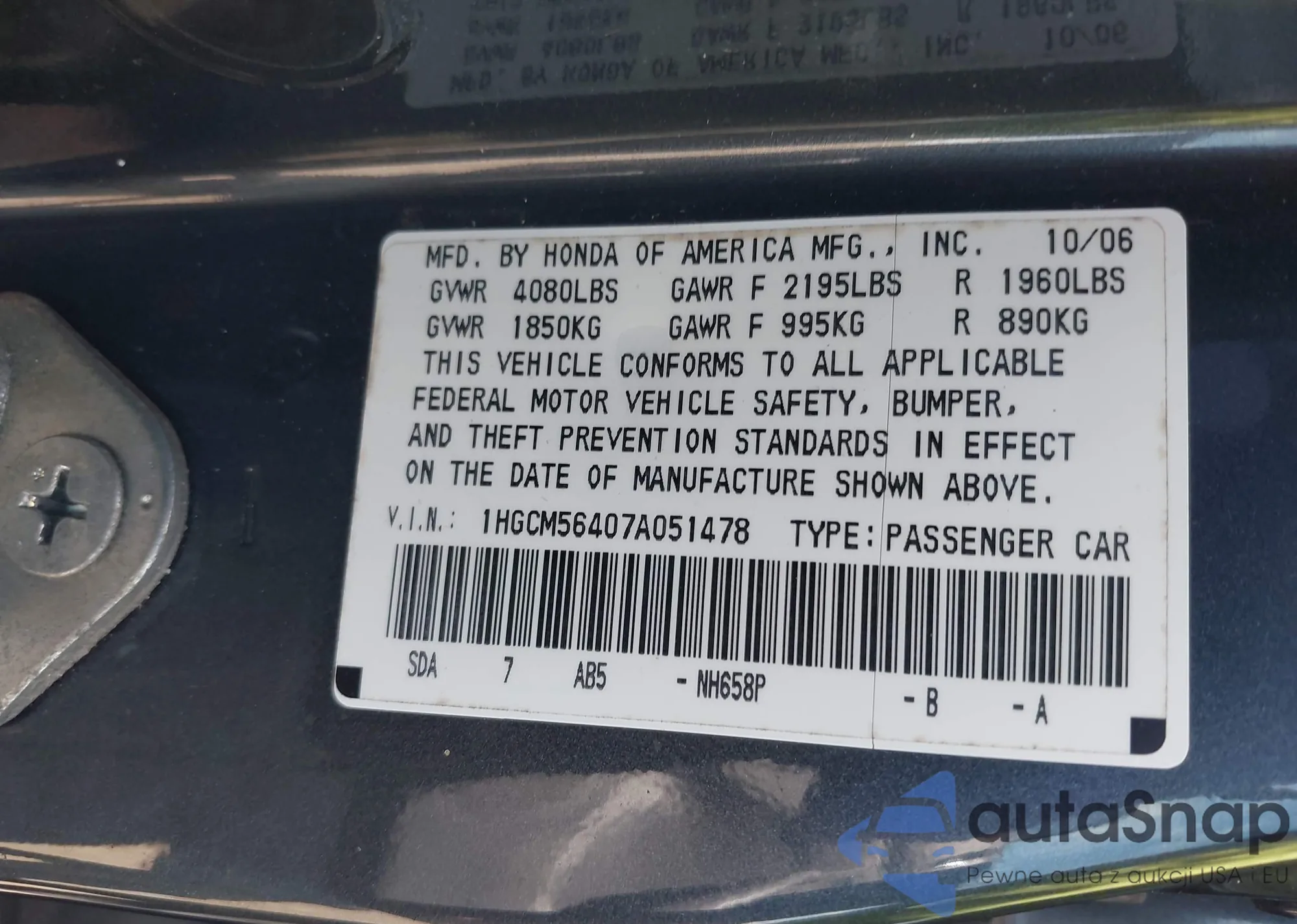 LOT: 43195363 VIN: 1HGCM56407A051478