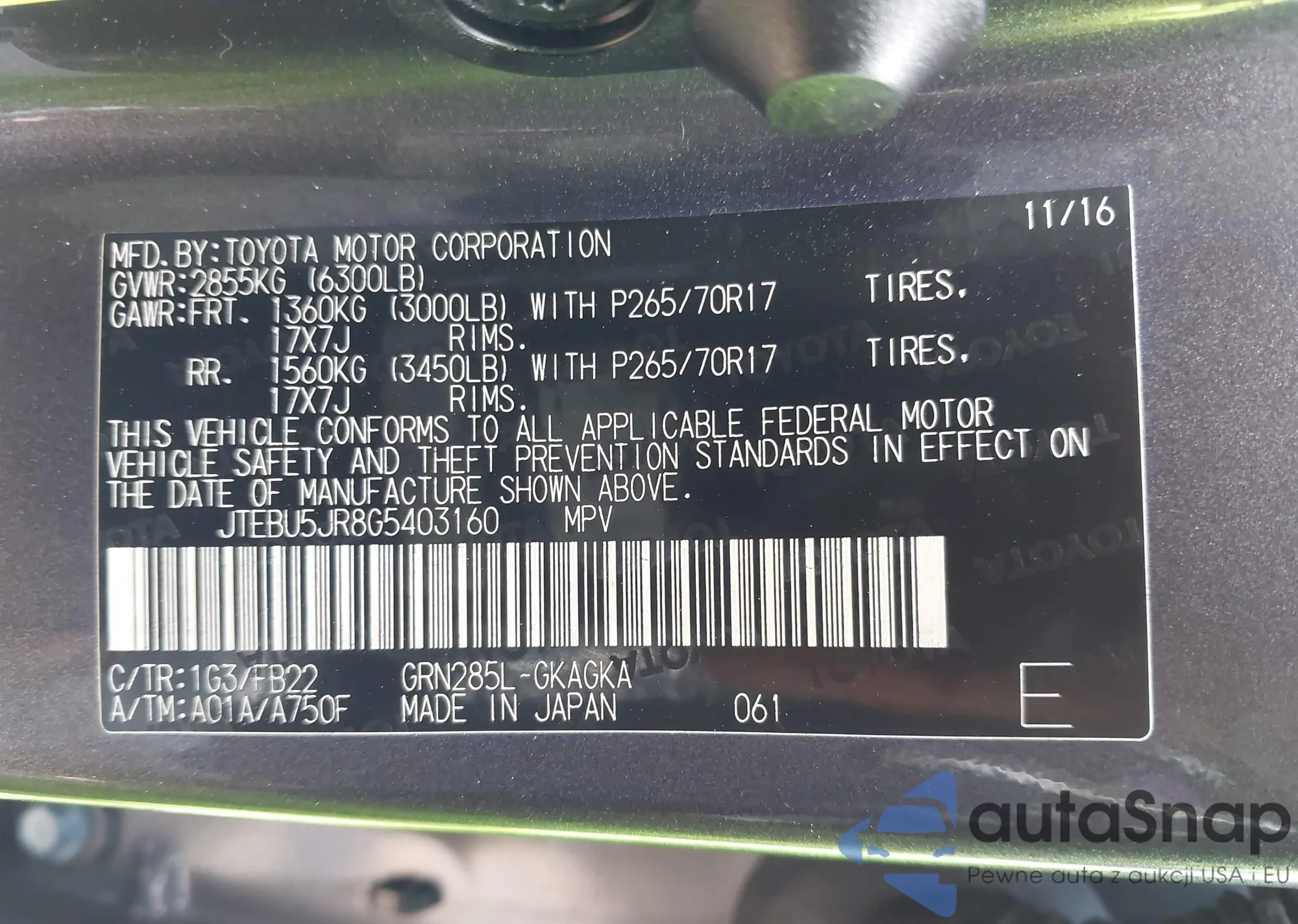 LOT: 42431204 VIN: JTEBU5JR8G5403160
