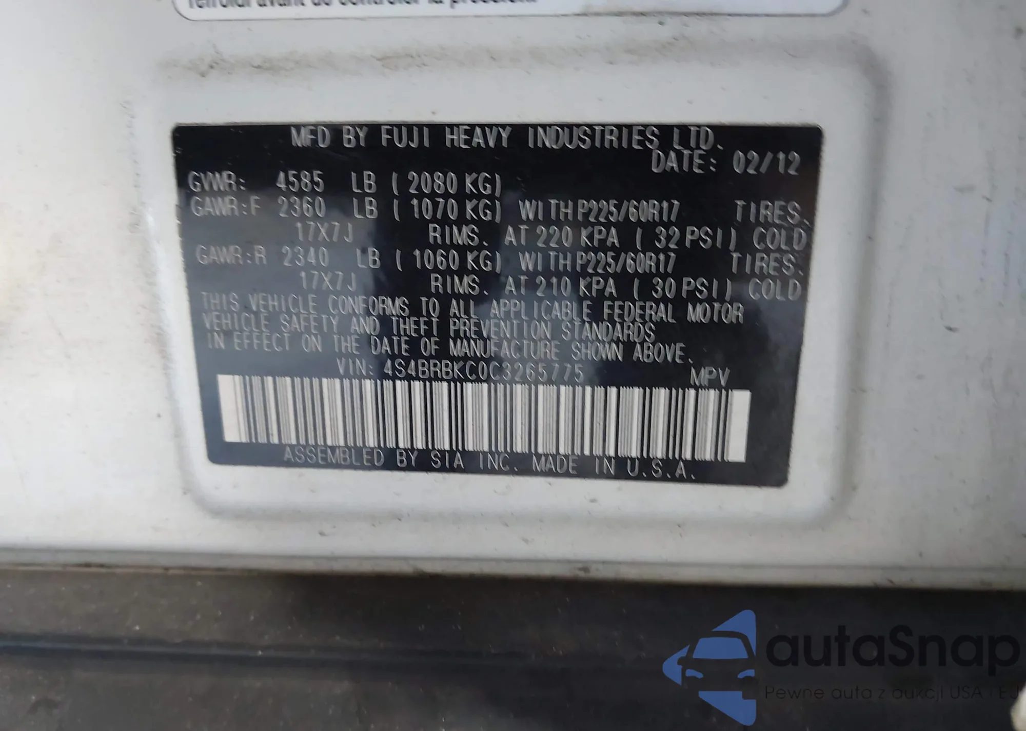 LOT: 43047876 VIN: 4S4BRBKC0C3265775