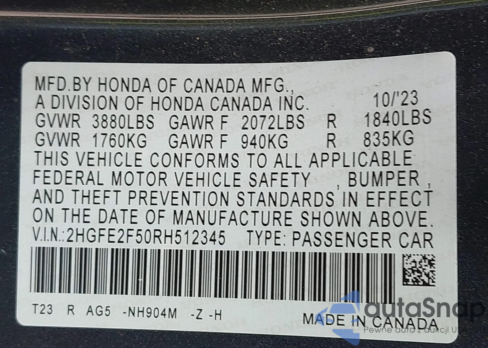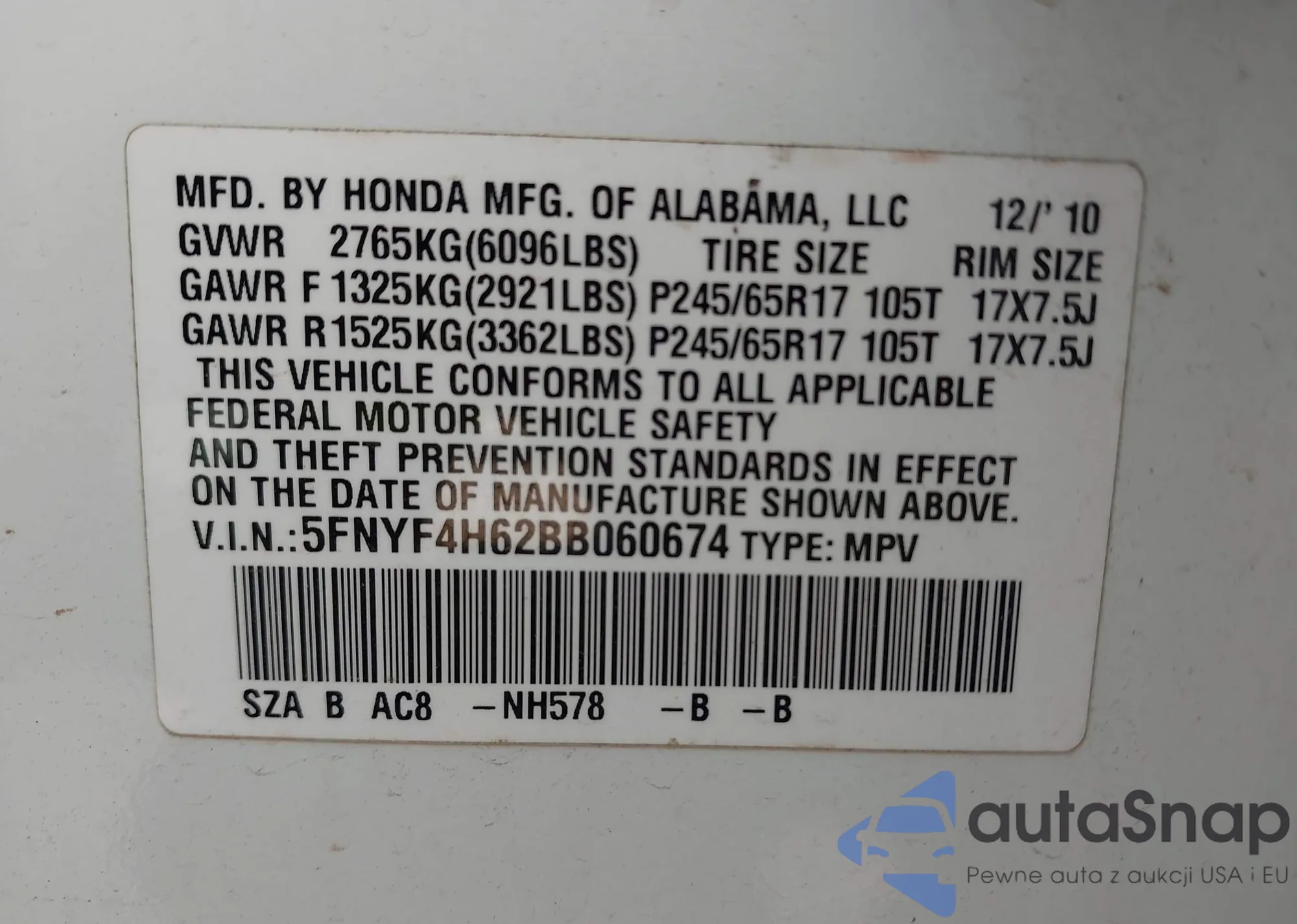 • VIN 5FNYF4H62BB060674