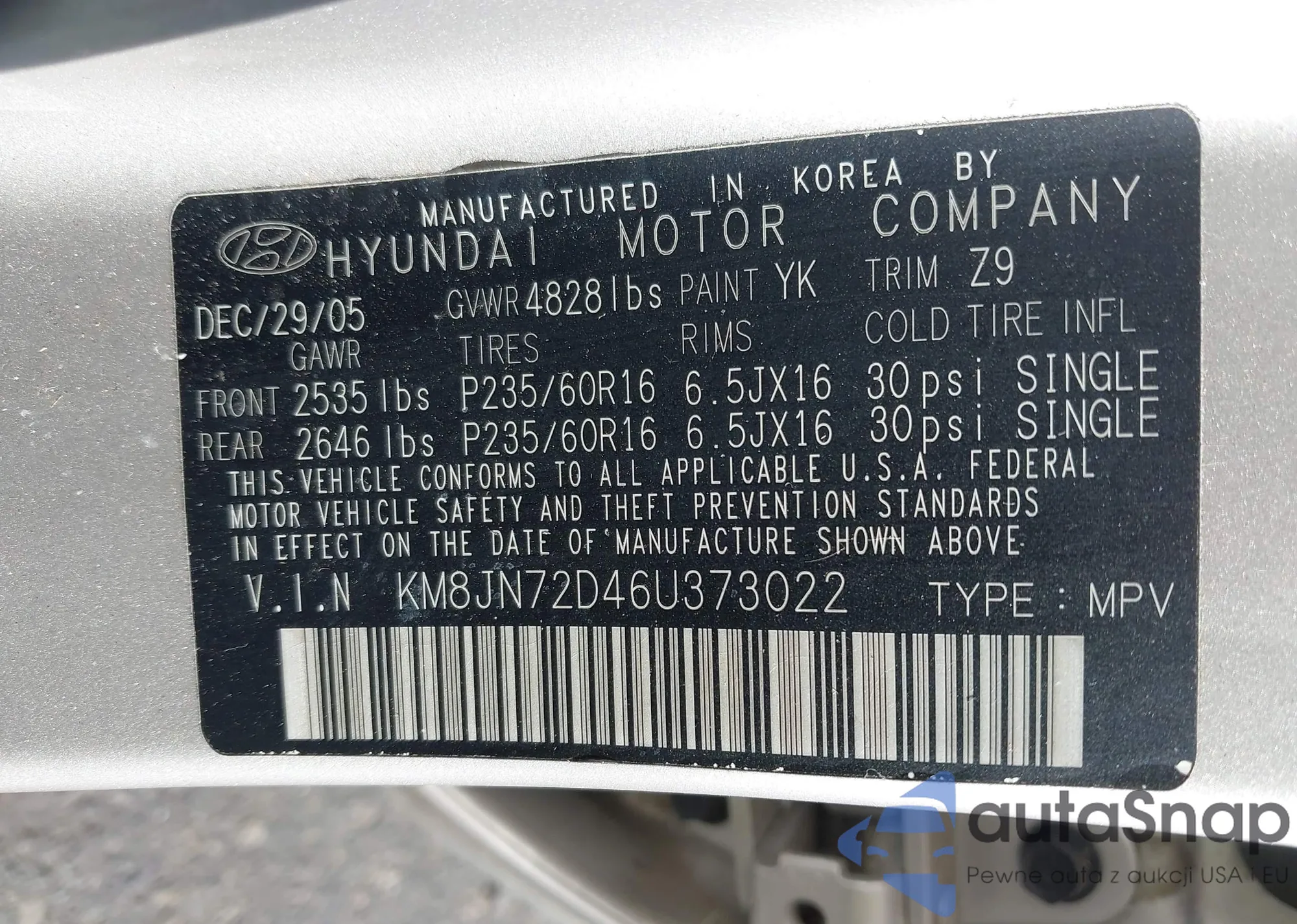 LOT: 42923360 VIN: KM8JN72D46U373022