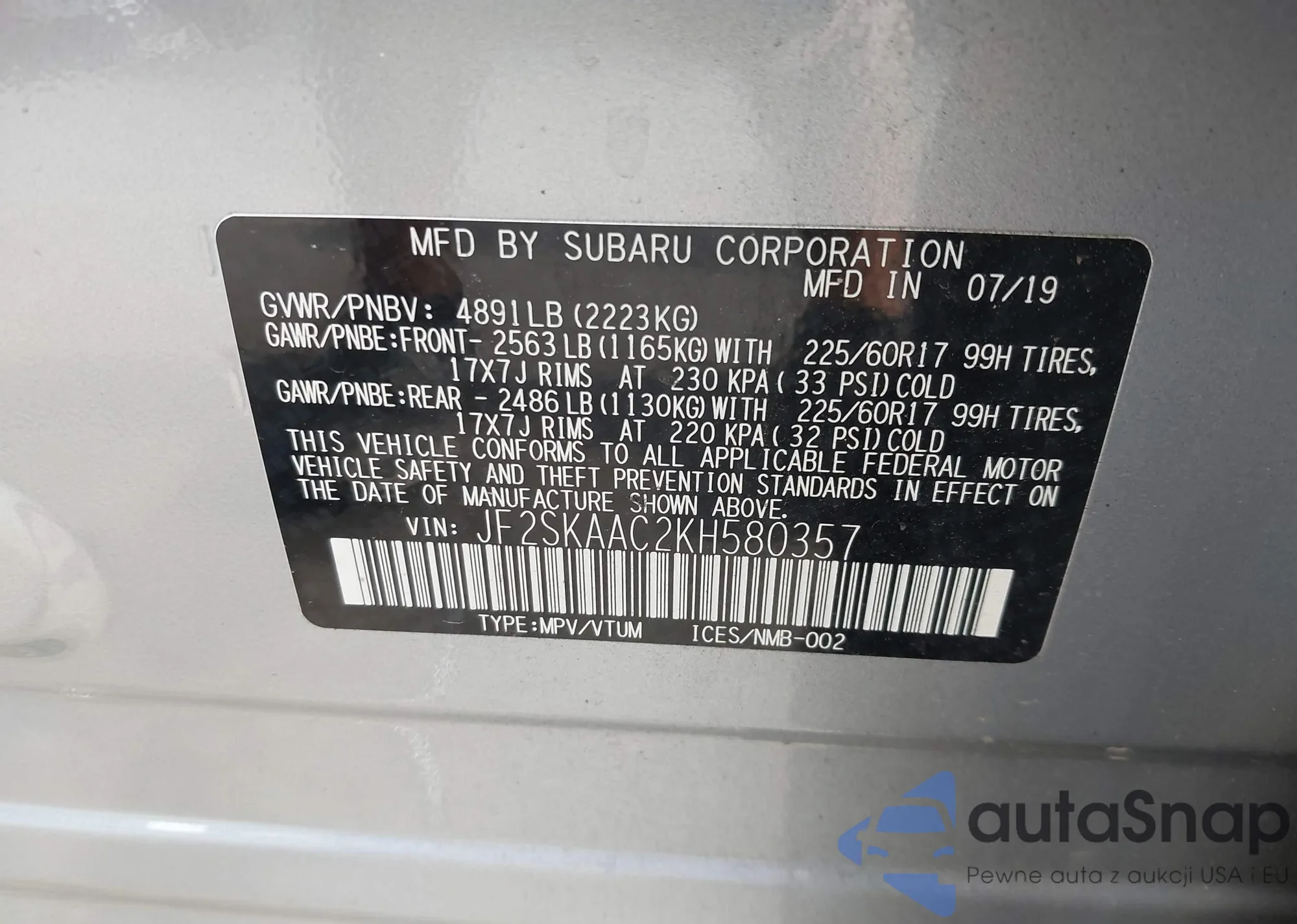 • VIN JF2SKAAC2KH580357