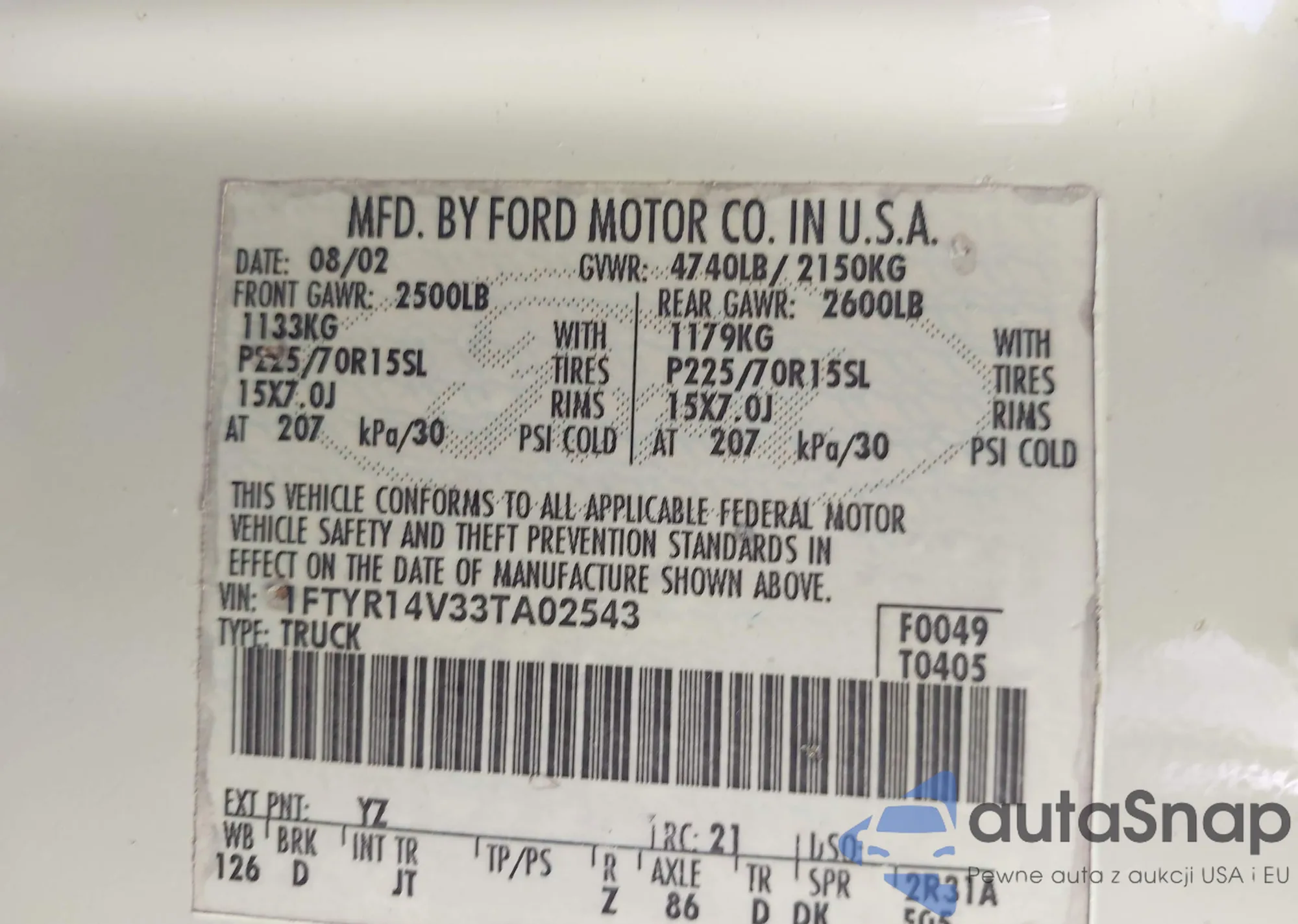 LOT: 43139255 VIN: 1FTYR14V33TA02543