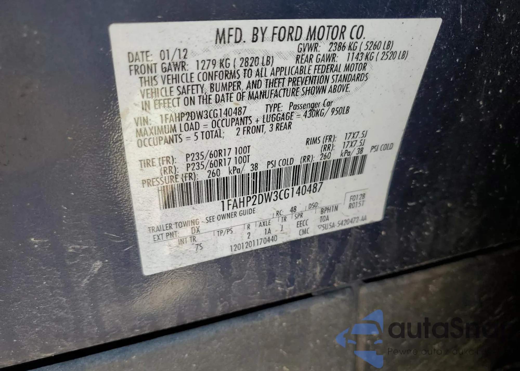 • VIN 3FAHP0KC4AR360353