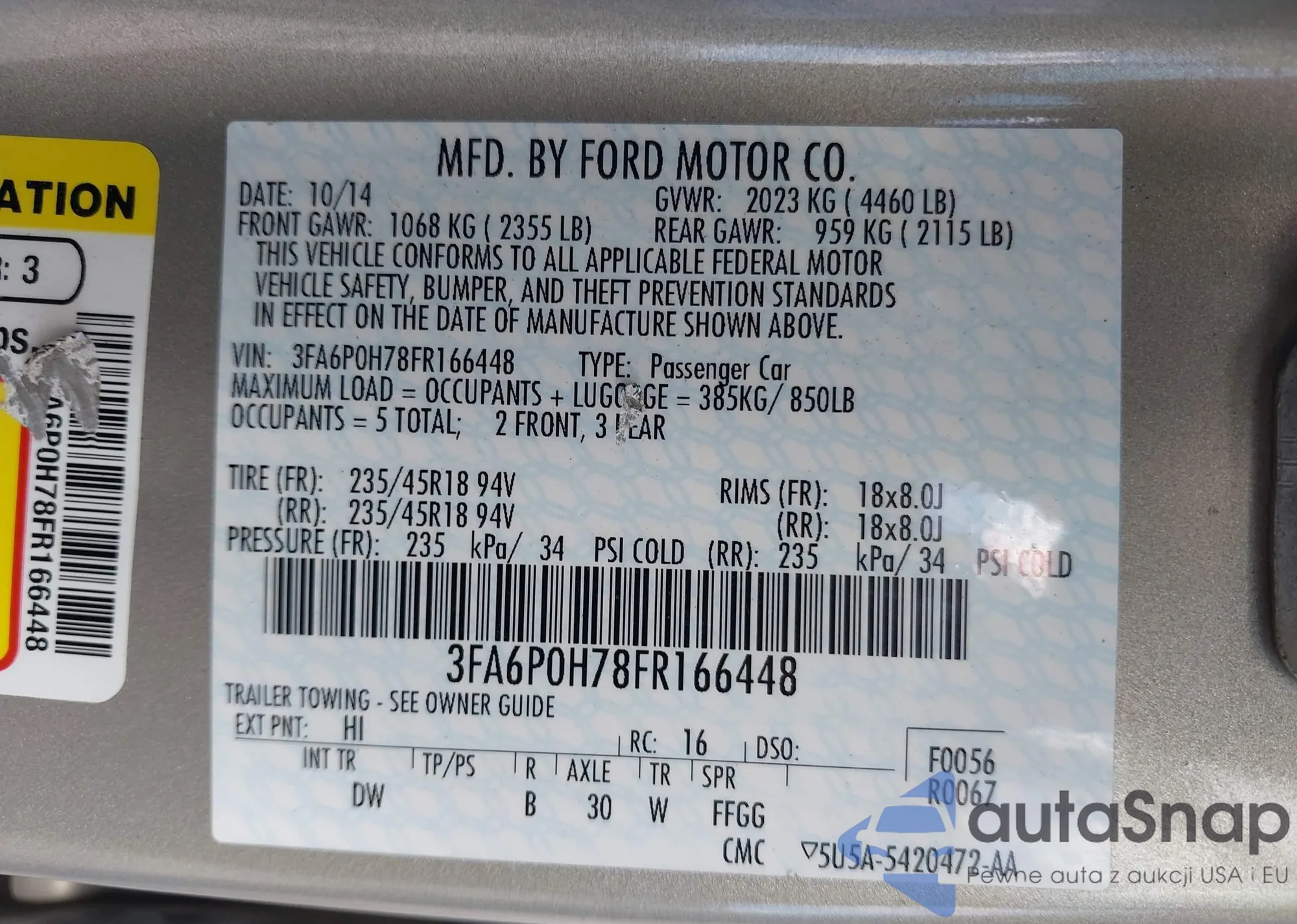 LOT: 43102330 VIN: 3FA6P0H78FR166448