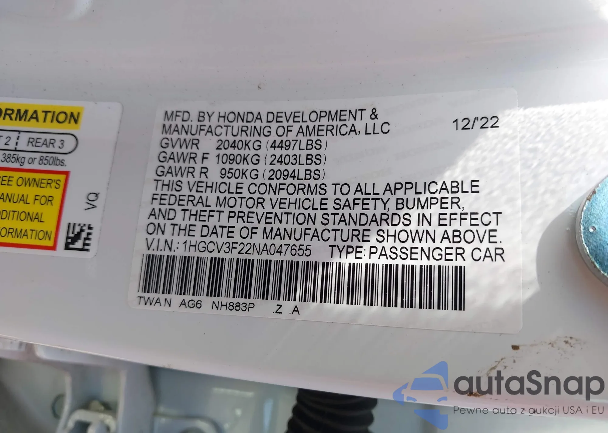 LOT: 43157973 VIN: 1HGCV3F22NA047655