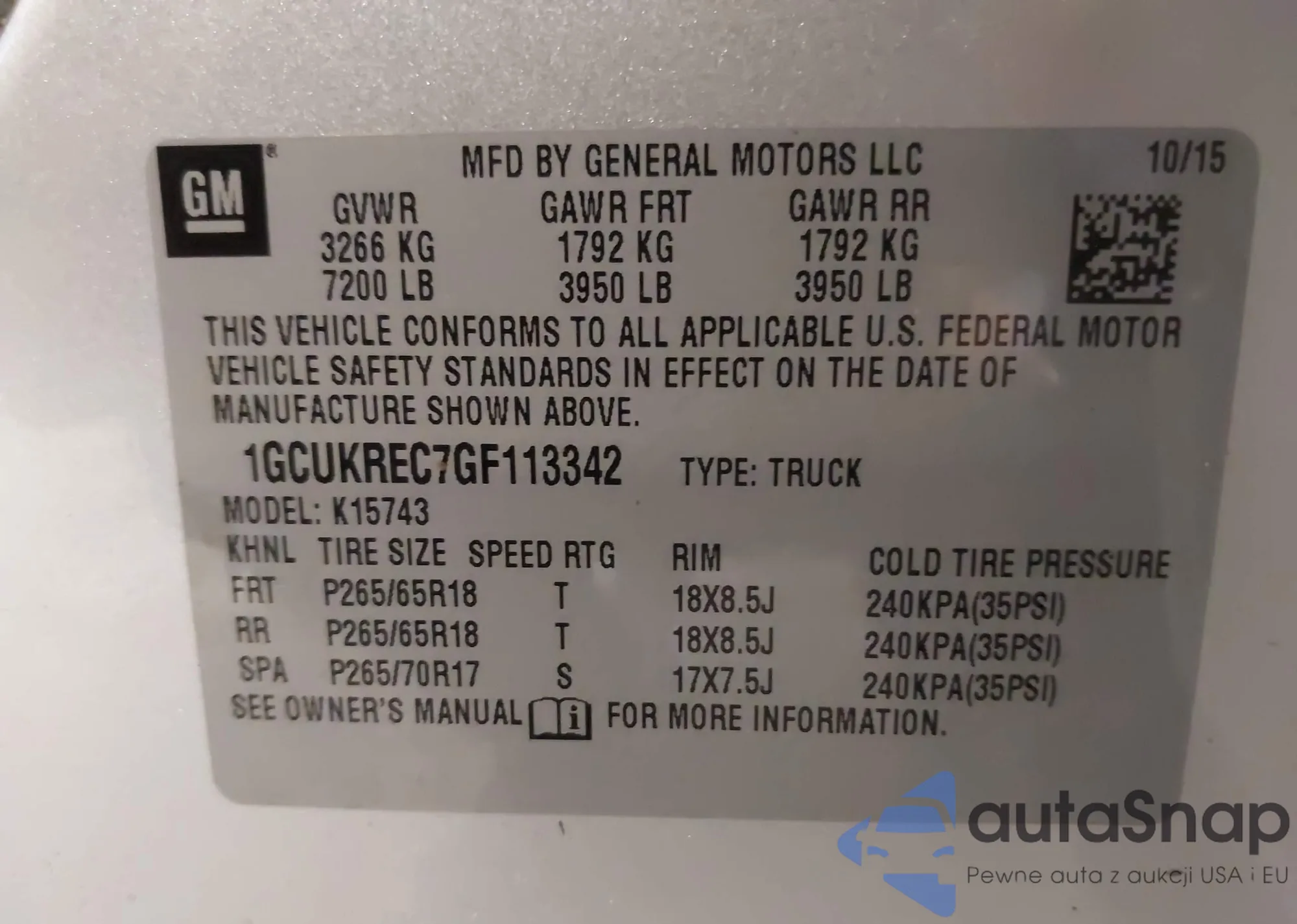 LOT: 42711230 VIN: 1GCUKREC7GF113342
