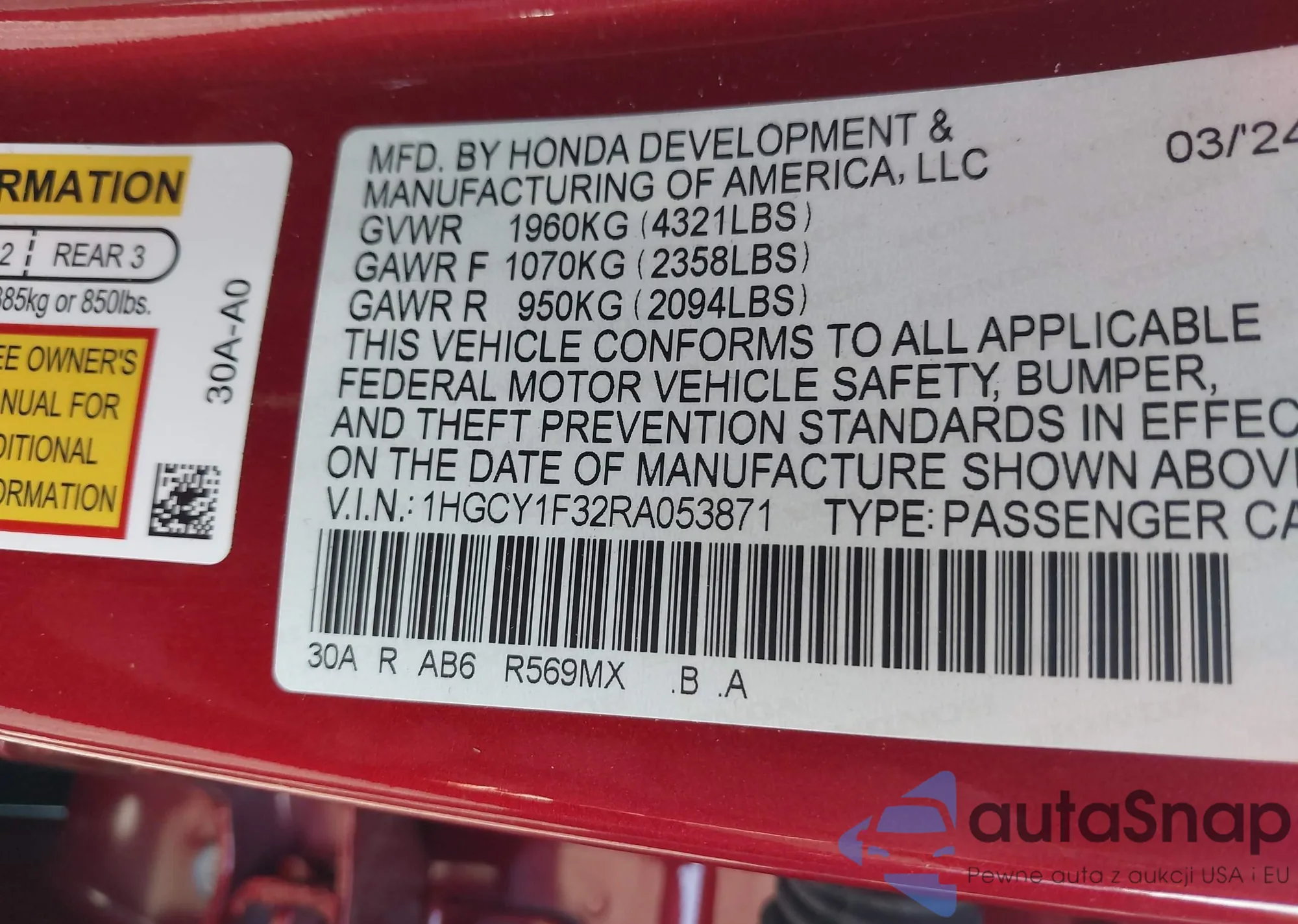 LOT: 43163454 VIN: 1HGCY1F32RA053871