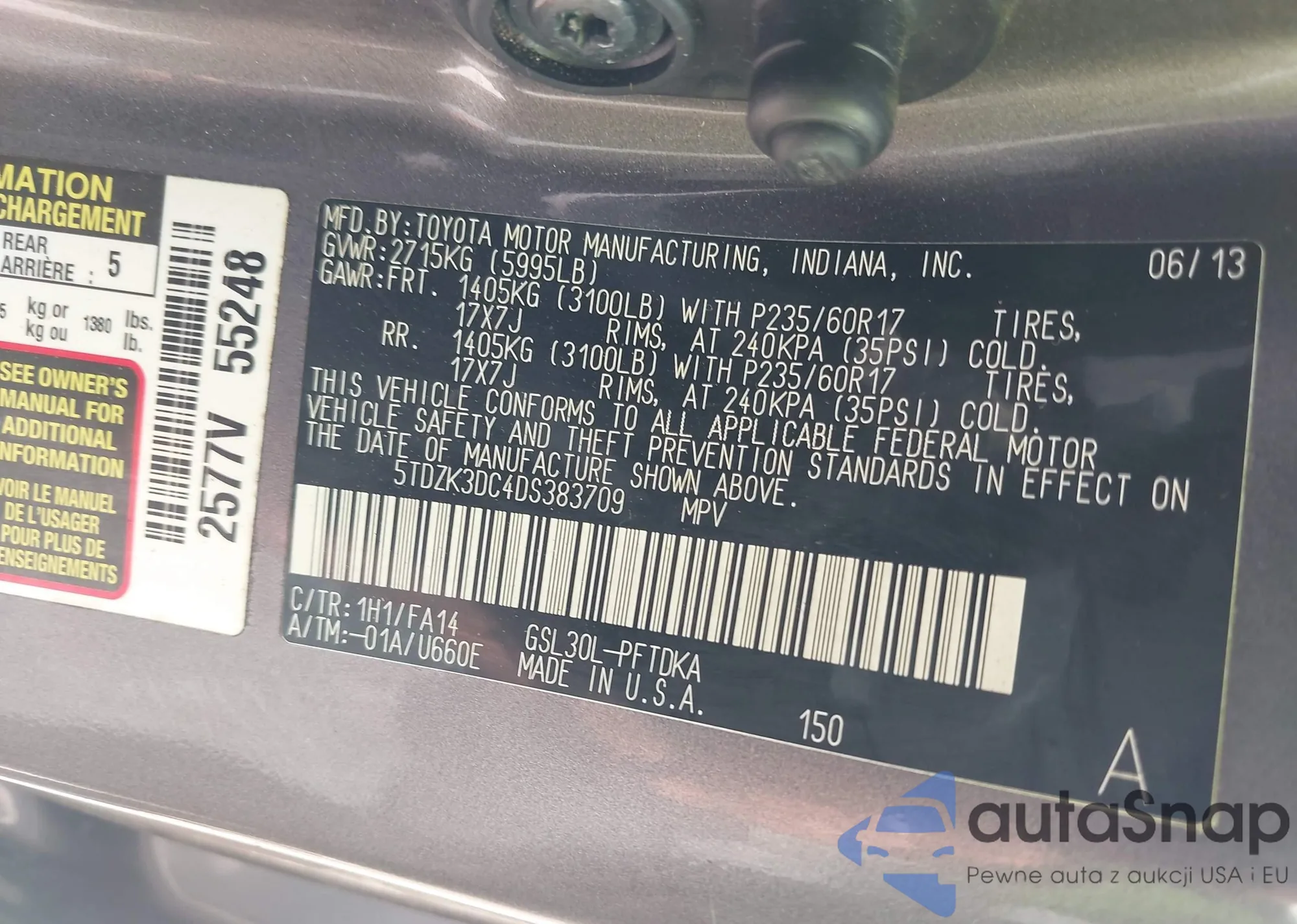 LOT: 43192981 VIN: 5TDZK3DC4DS383709