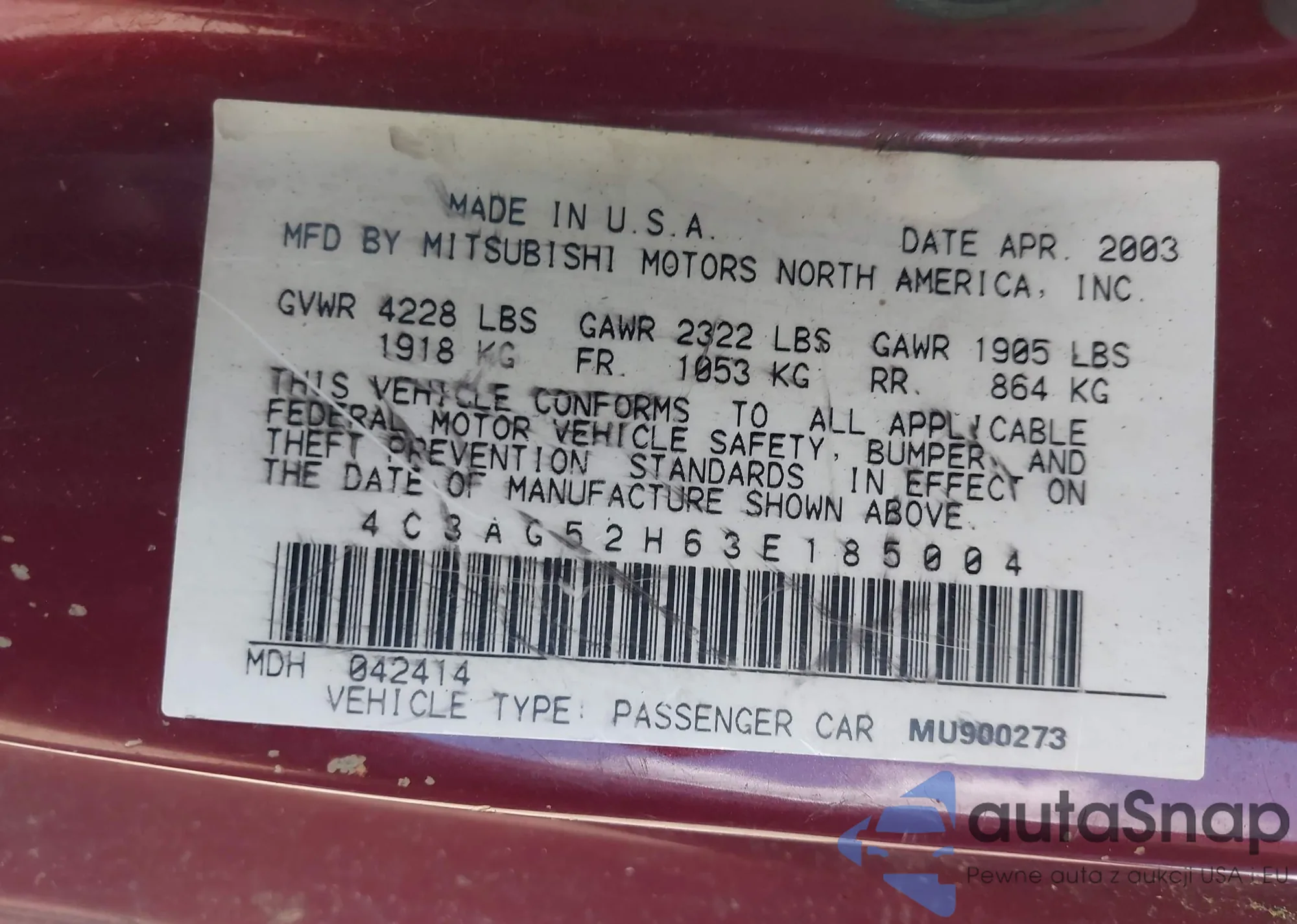 • VIN 4C3AG52H63E185004
