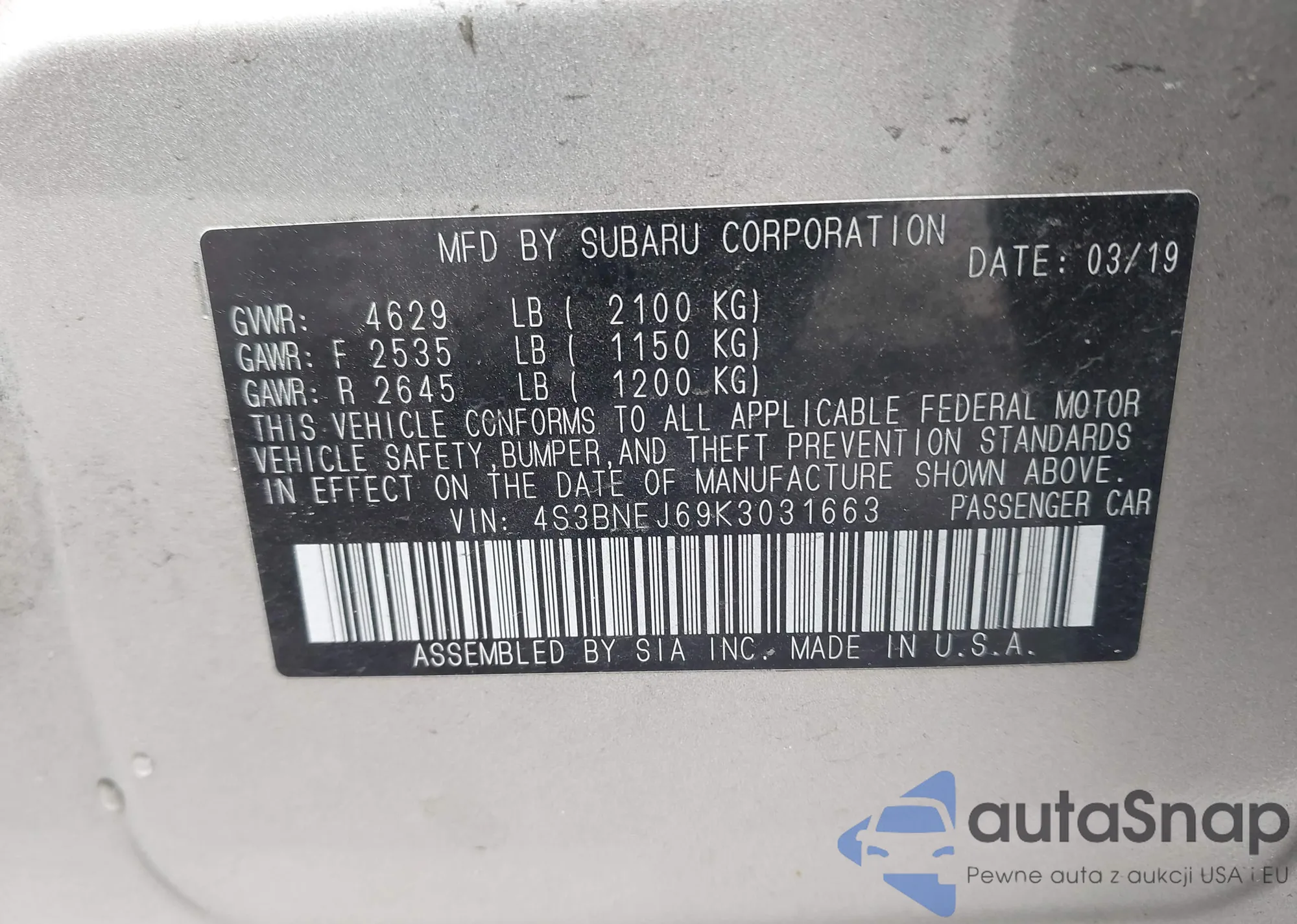 • VIN 4S3BNEJ69K3031663