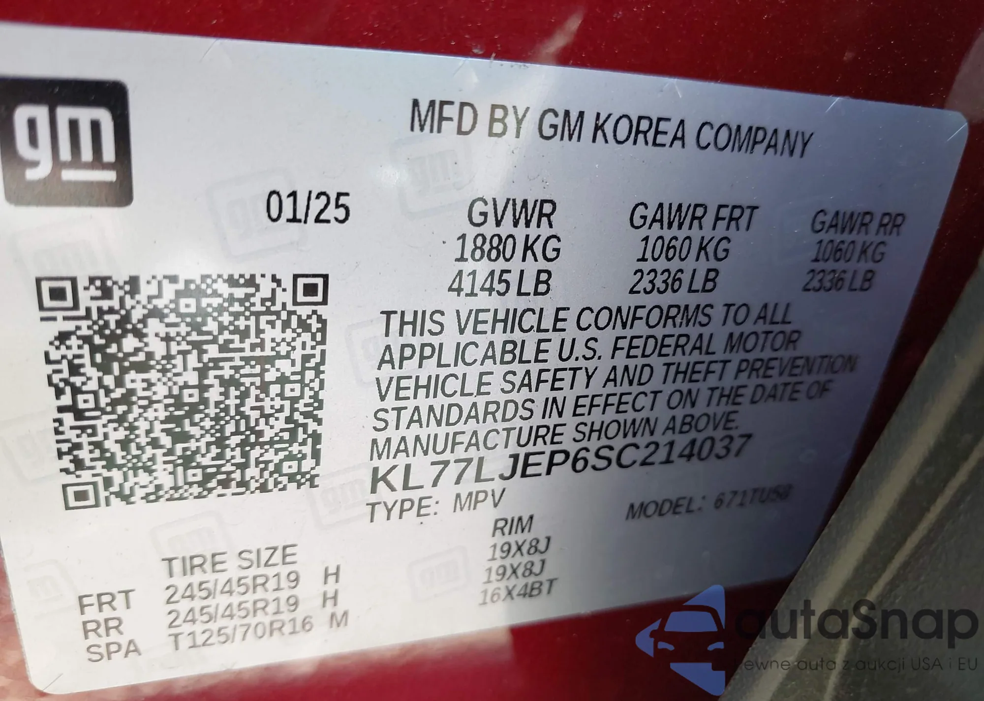 LOT: 42733976 VIN: KL77LJEP6SC214037