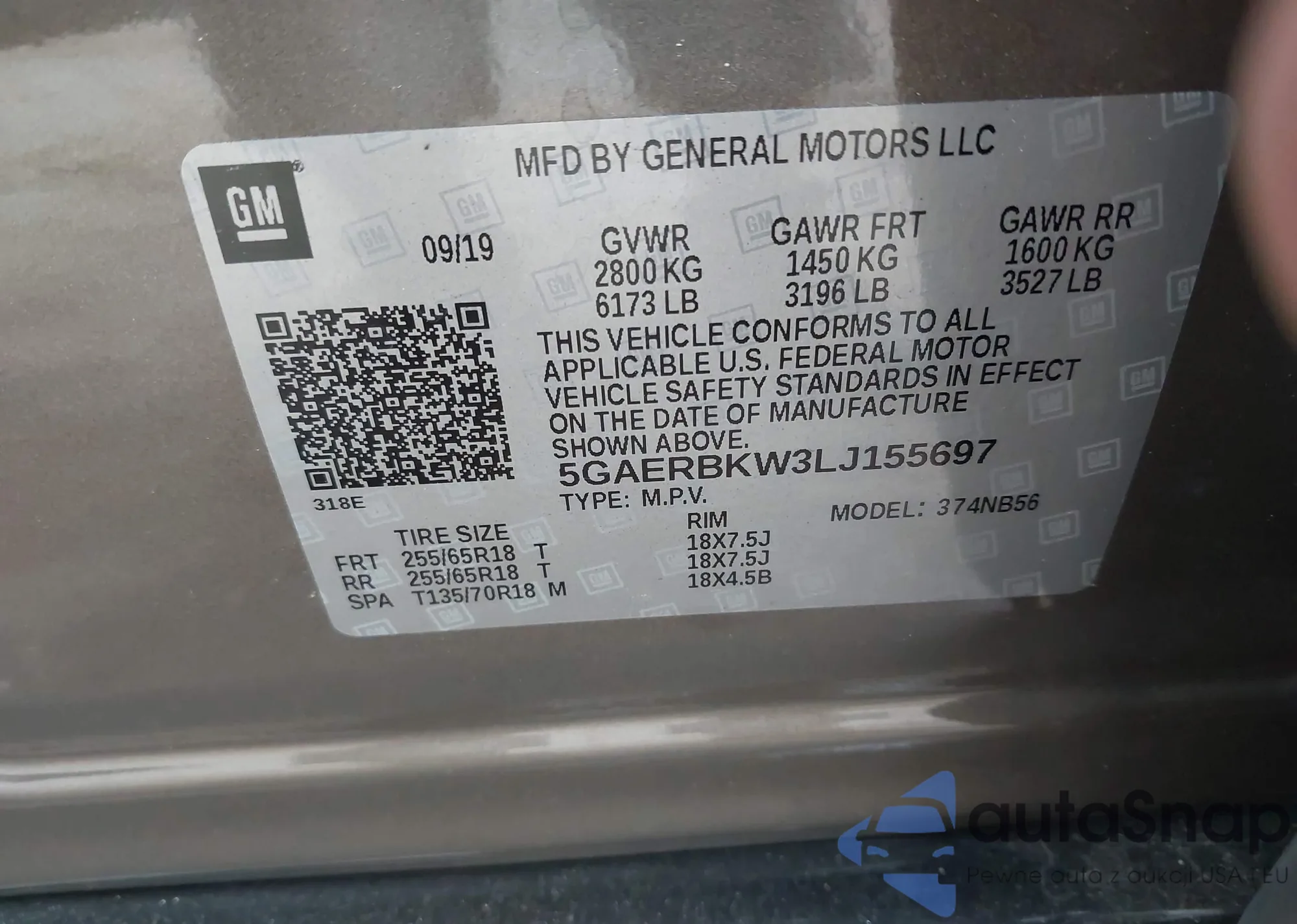 LOT: 42902435 VIN: 5GAERBKW3LJ155697