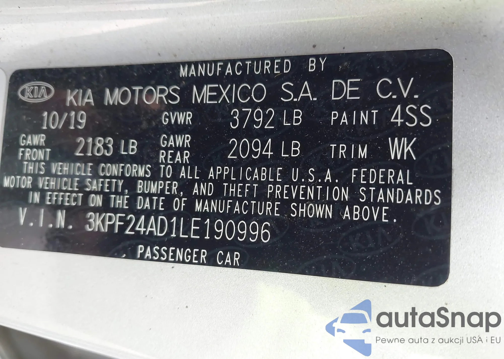 LOT: 42996291 VIN: 3KPF24AD1LE190996