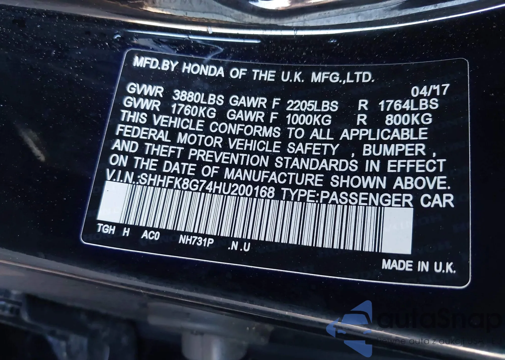 • VIN SHHFK8G74HU200168