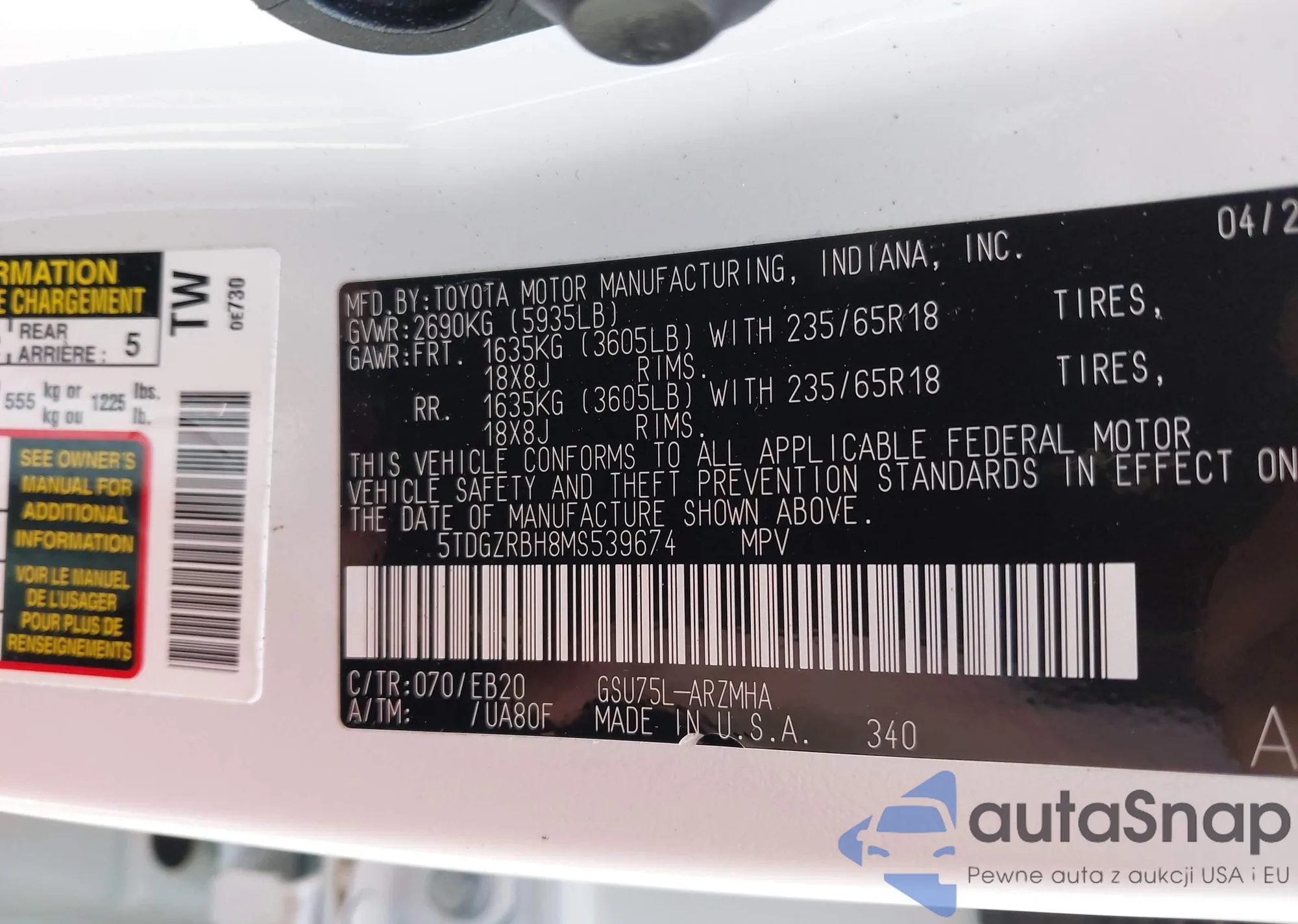 • VIN 5TDGZRBH8MS539674