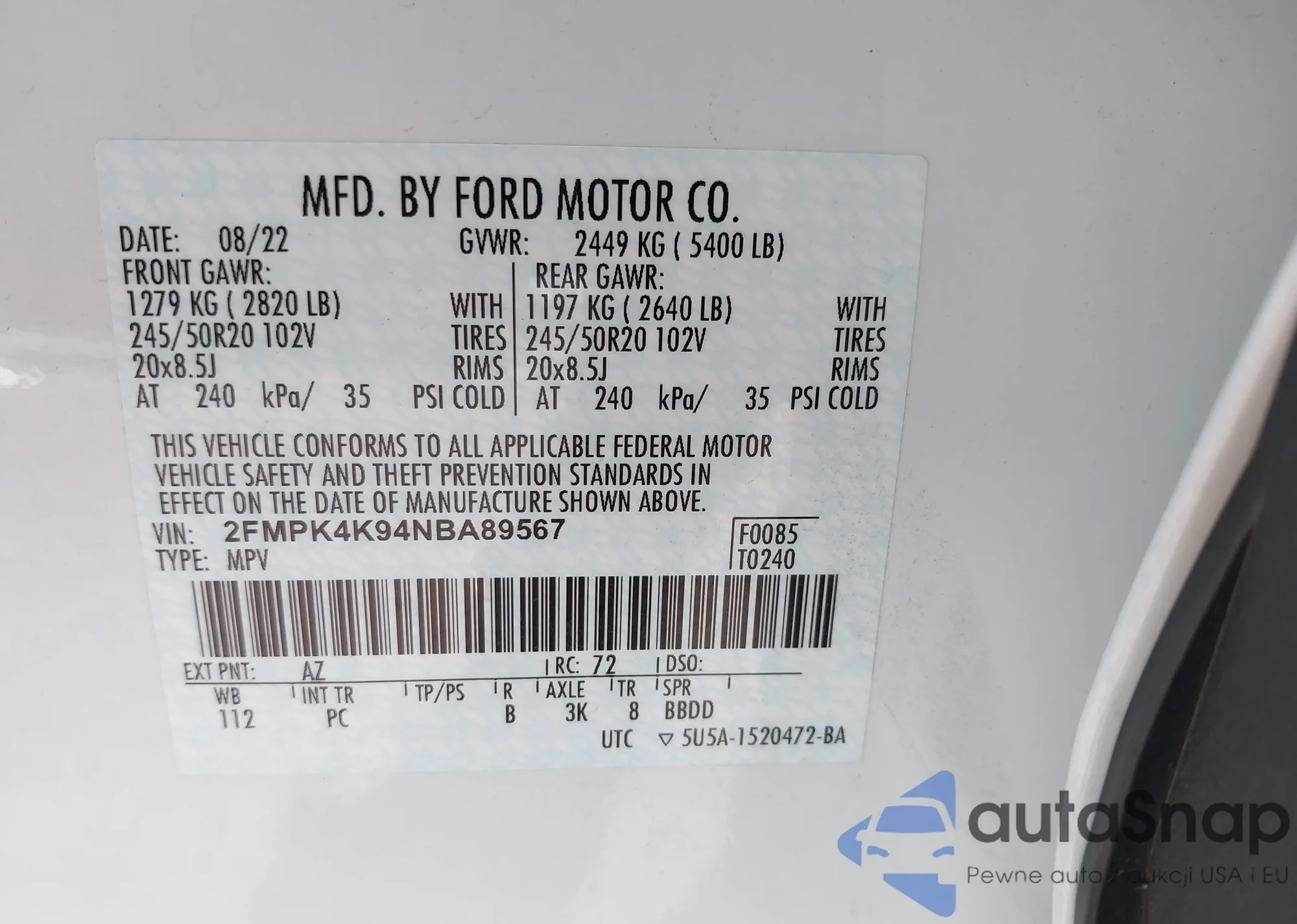 • VIN 2FMPK4K94NBA89567