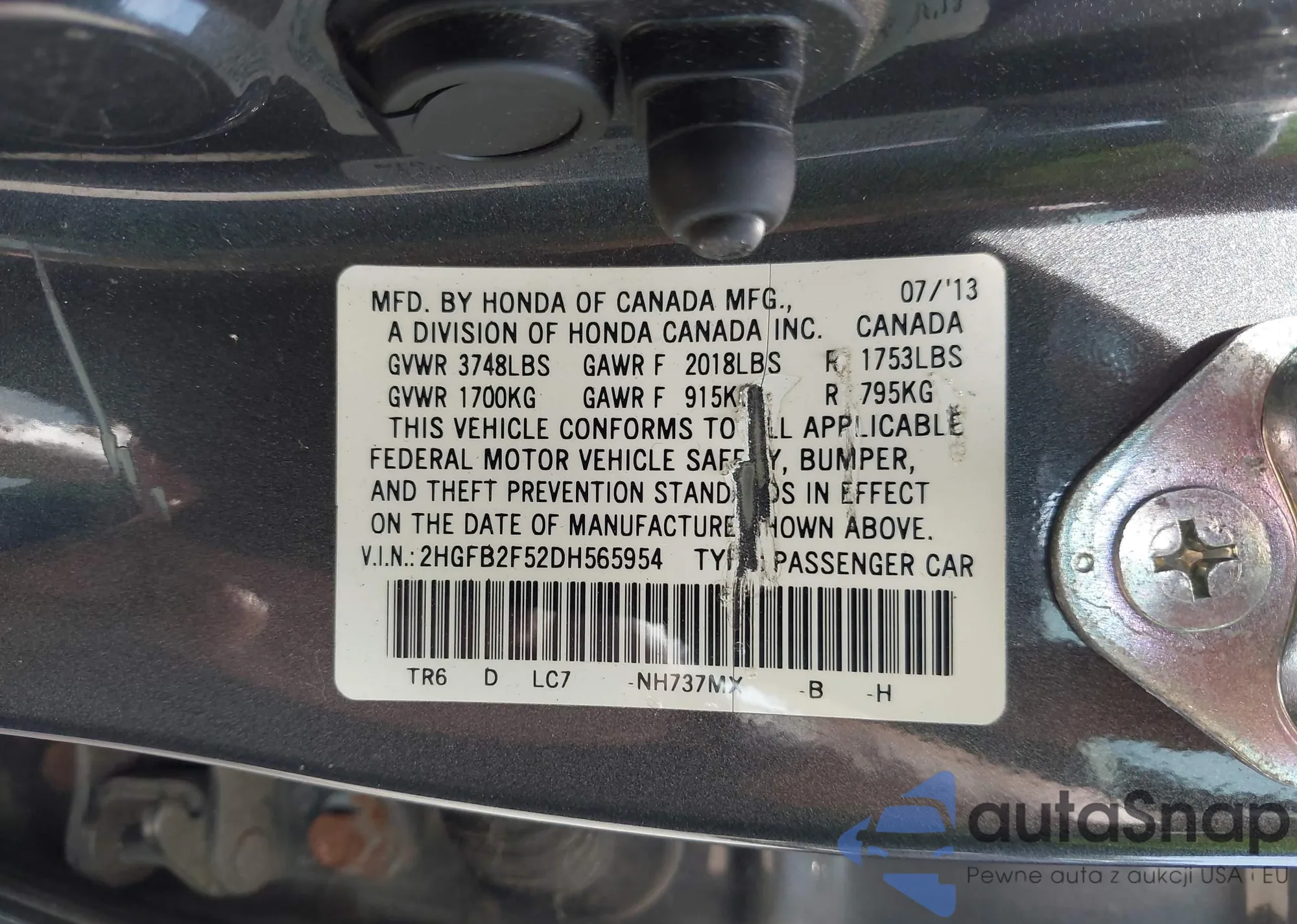 LOT: 40353719 VIN: 2HGFB2F52DH565954