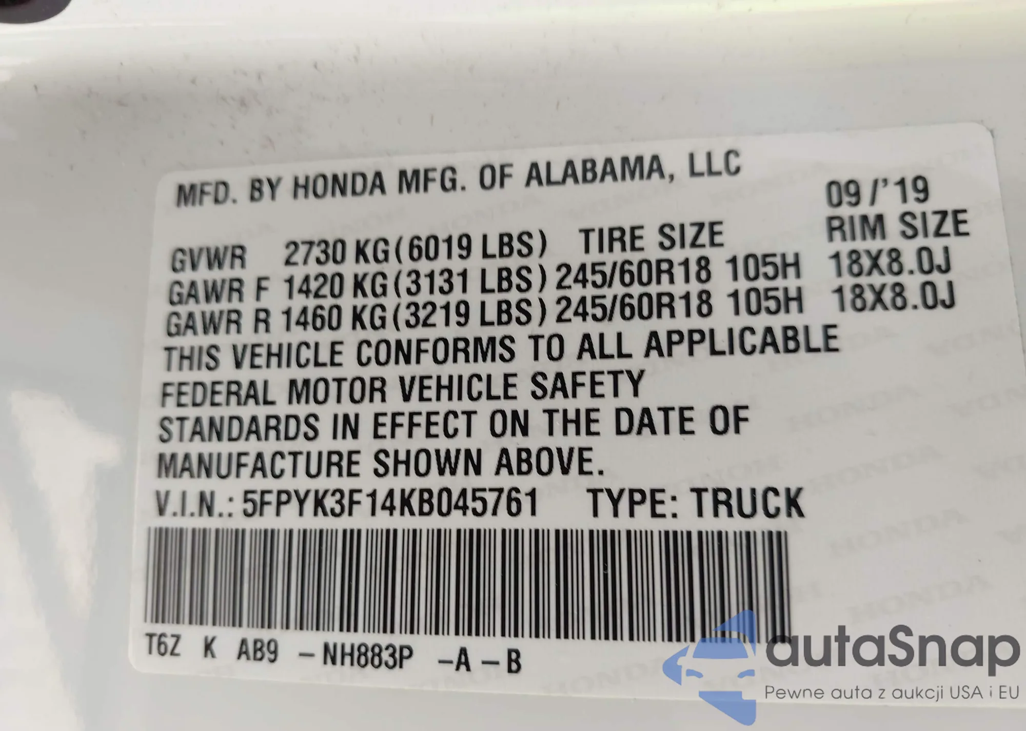 • VIN 5FPYK3F14KB045761