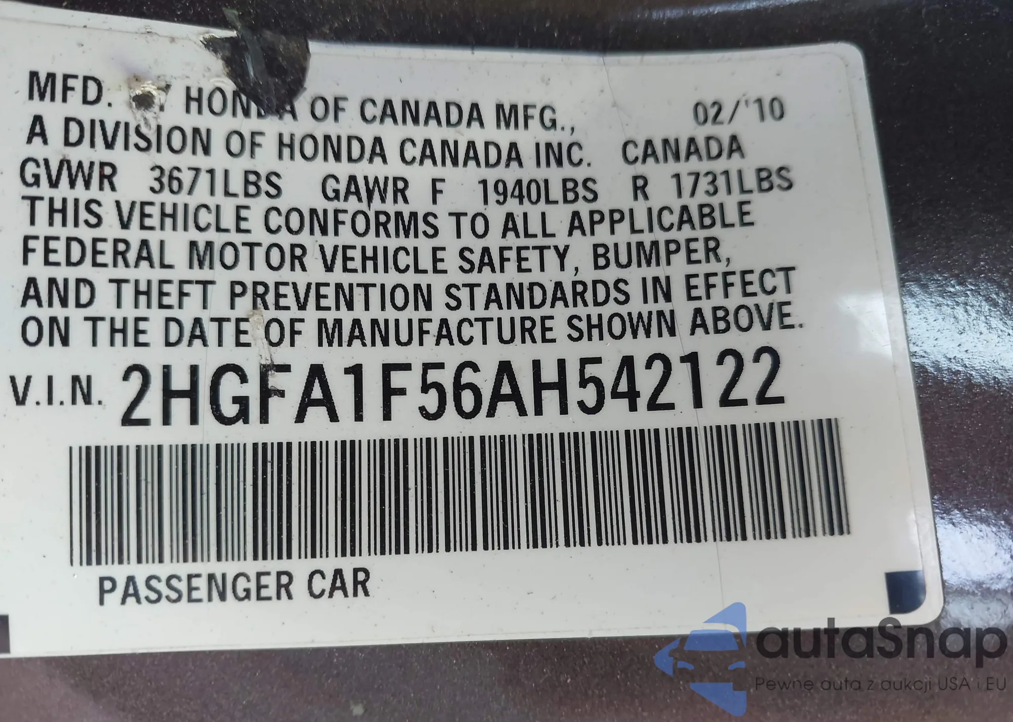 • VIN 2HGFA1F56AH542122