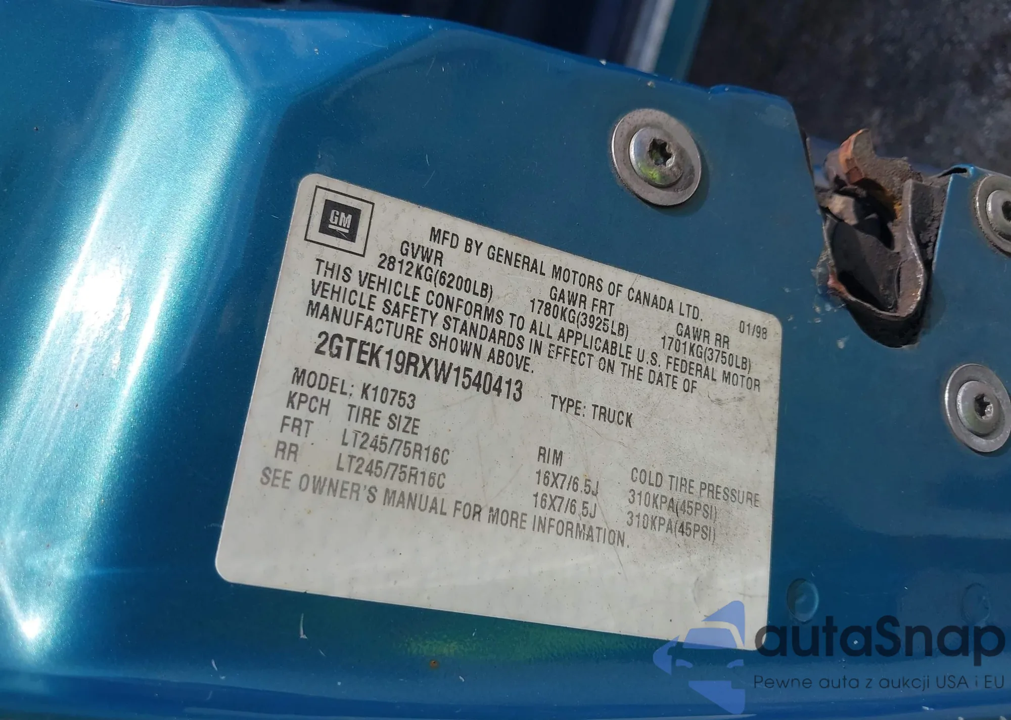 • VIN 2GTEK19RXW1540413