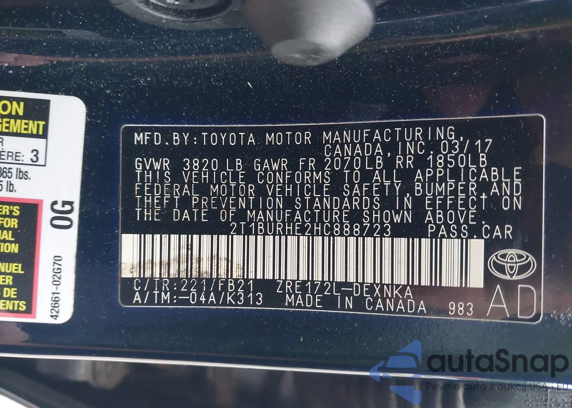 LOT: 42697767 VIN: 2T1BURHE2HC888723