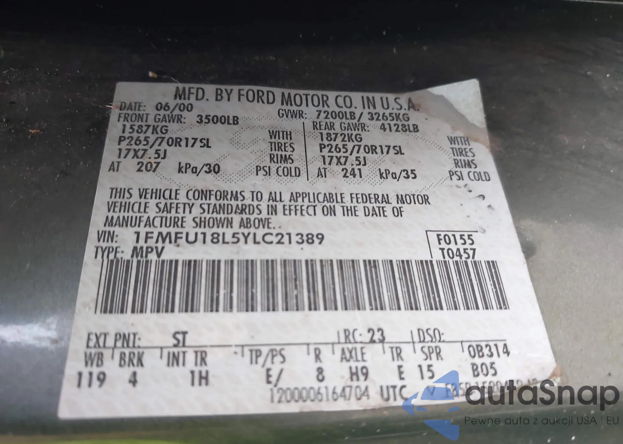 LOT: 43145829 VIN: 1FMFU18L5YLC21389