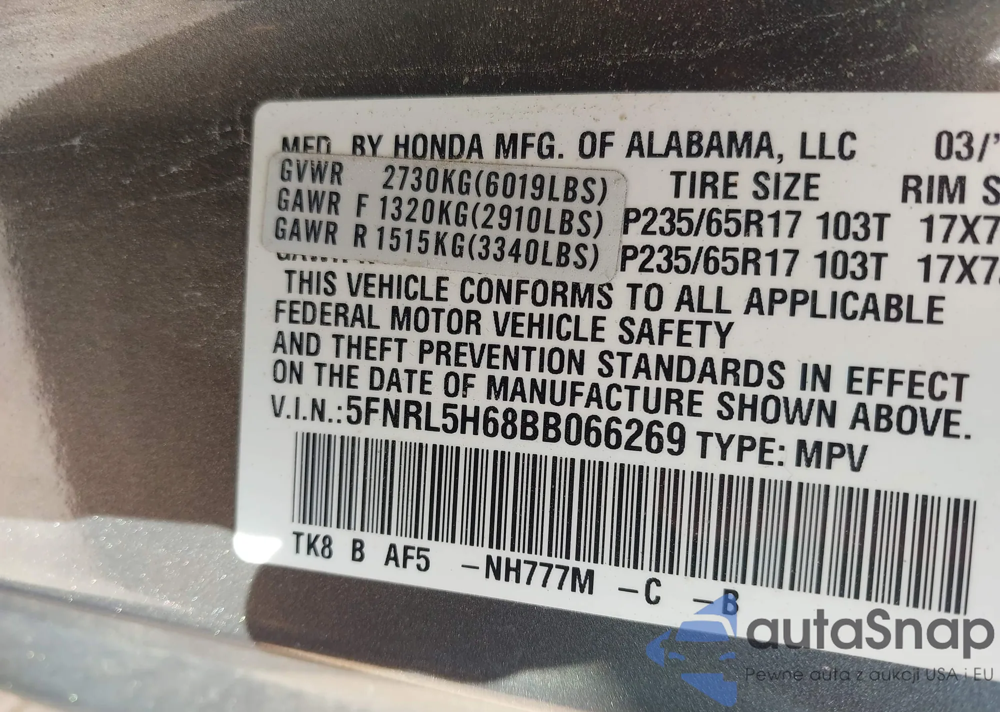 • VIN 5FNRL5H68BB066269