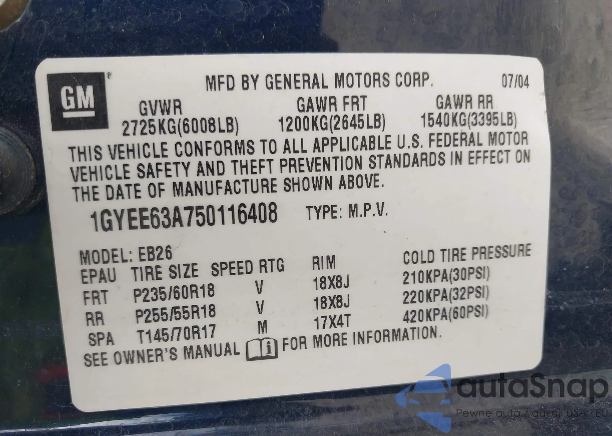 LOT: 43253215 VIN: 1GYEE63A750116408
