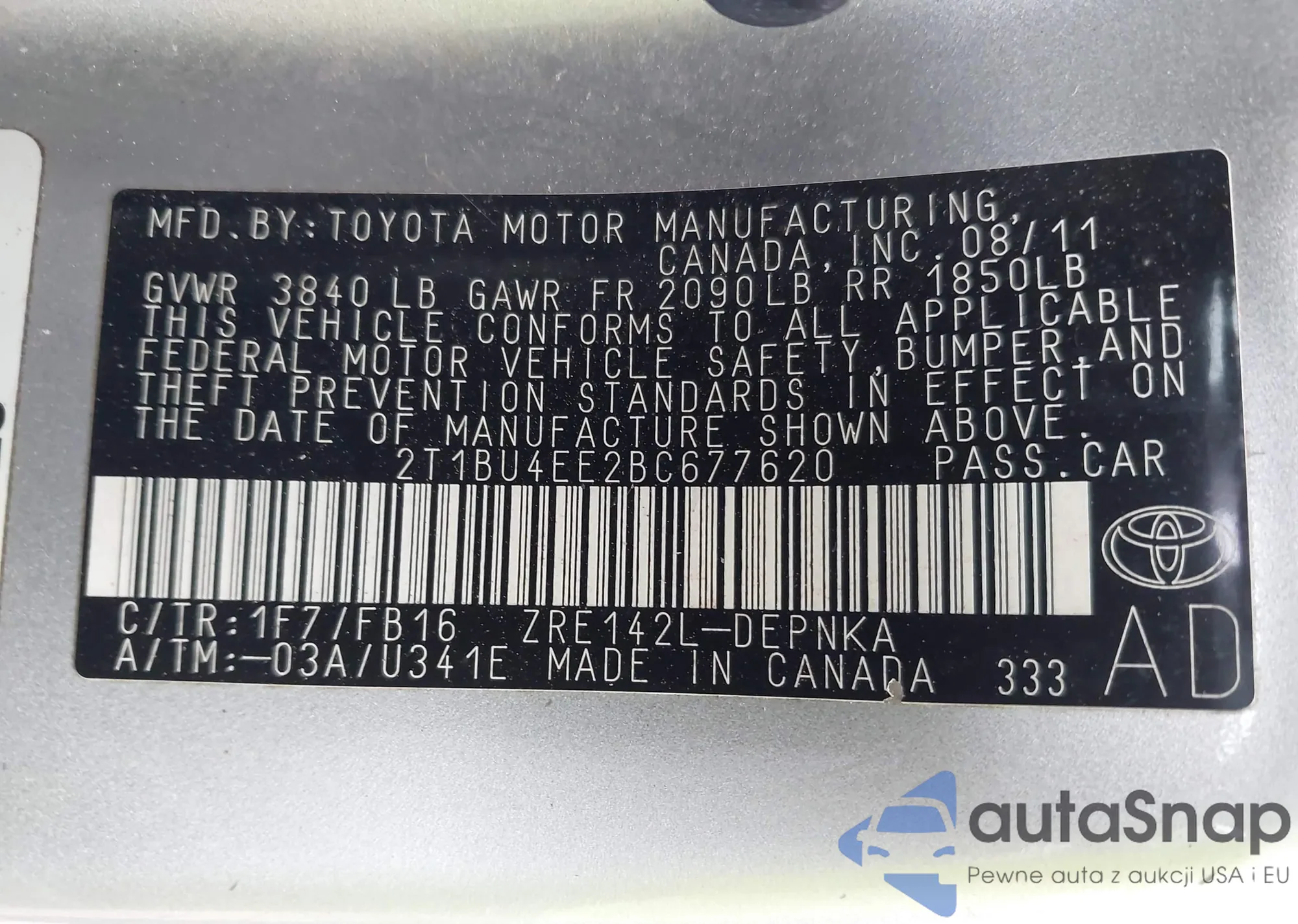 LOT: 43049502 VIN: 4T4BF3EK8BR143052