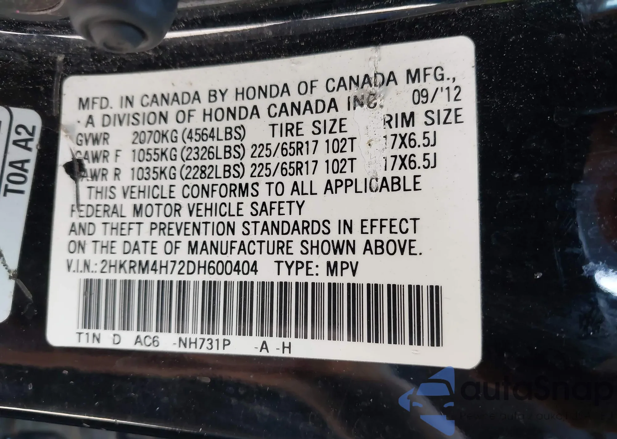 • VIN 2HKRM4H72DH600404
