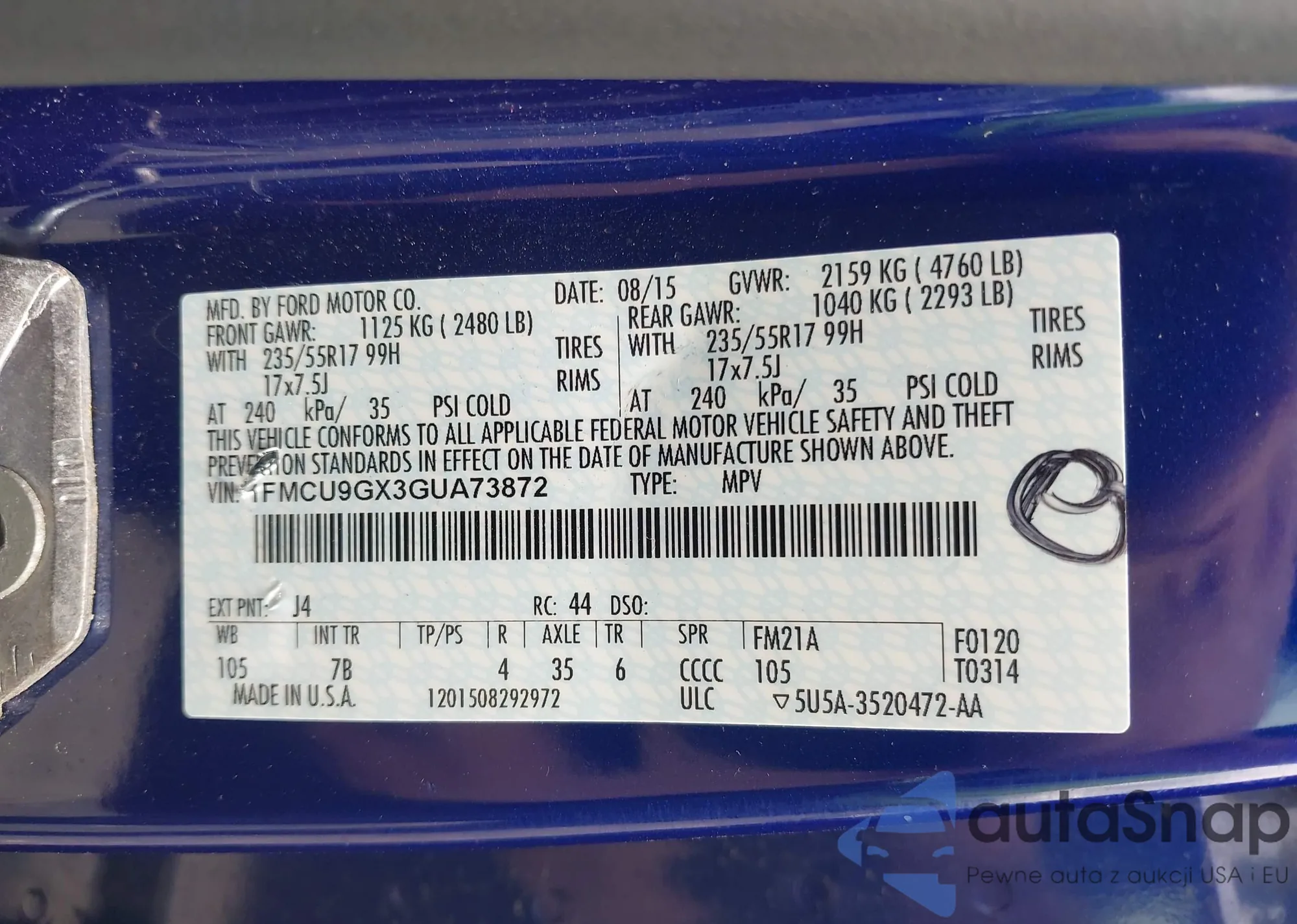 • VIN 1FMCU9GX3GUA73872