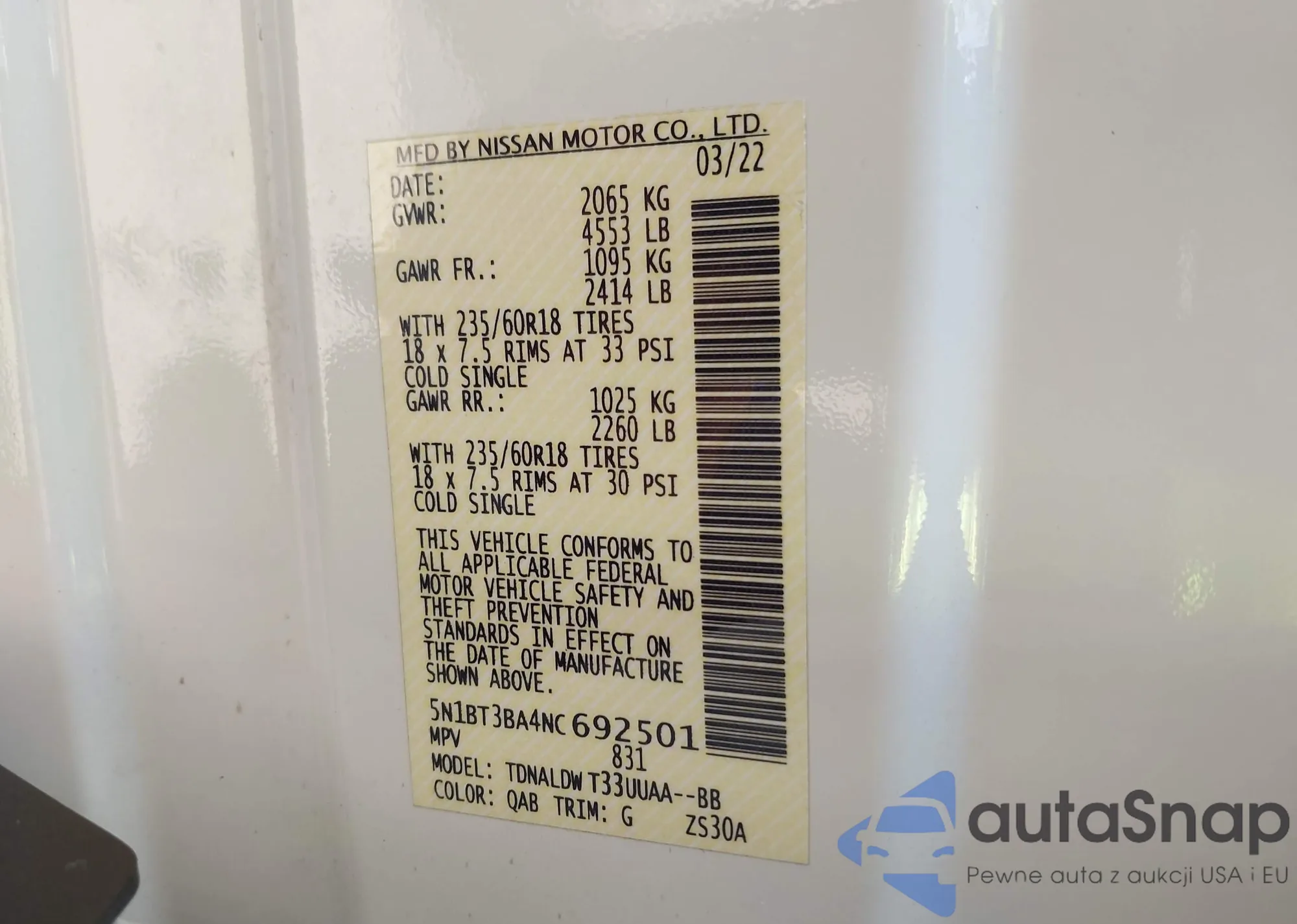 LOT: 42855829 VIN: 5N1BT3BA4NC692501