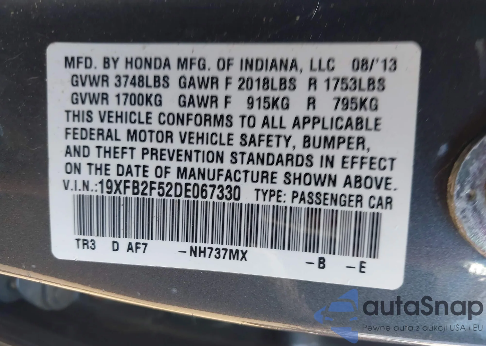 • VIN 19XFB2F52DE067330