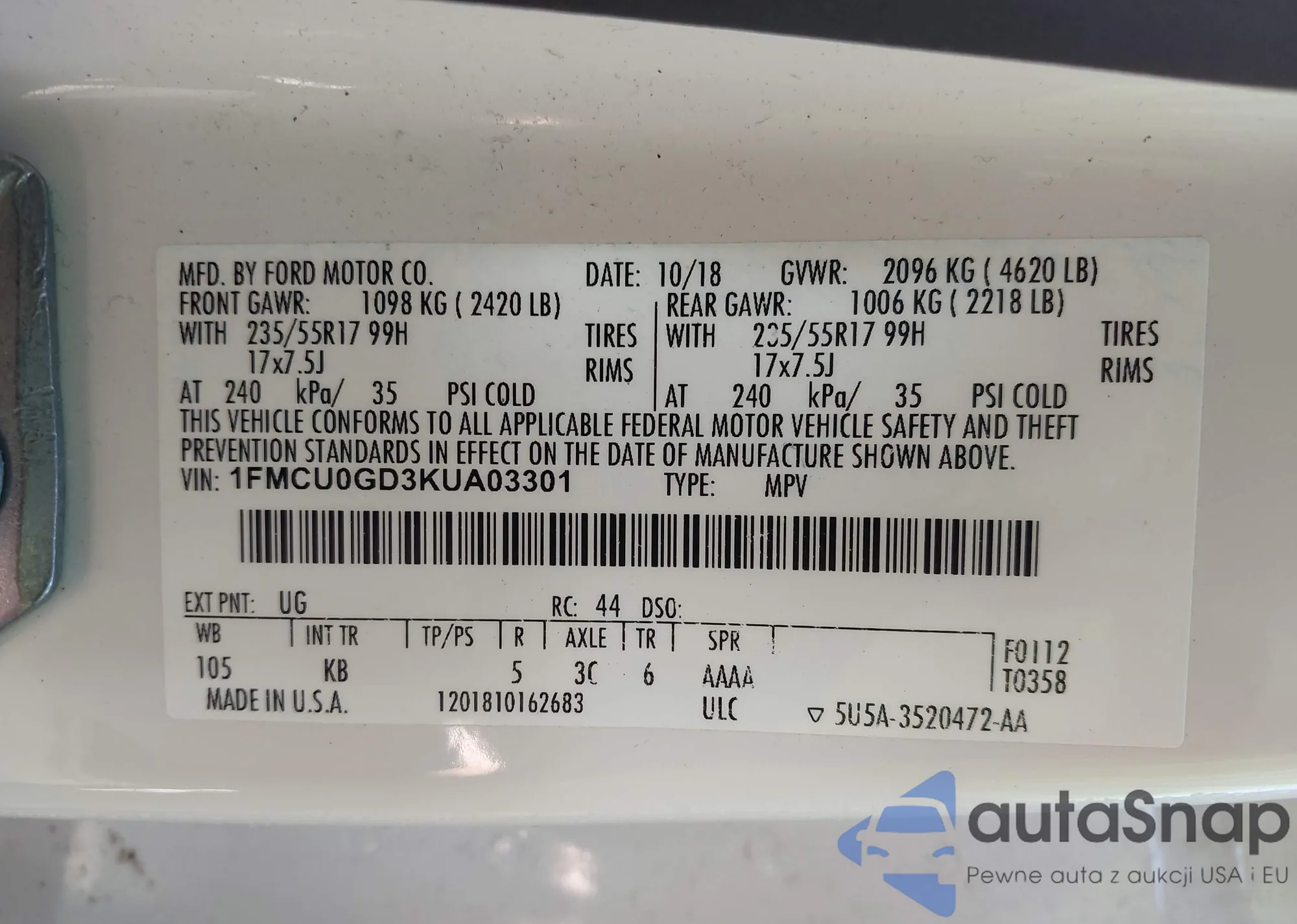 • VIN 1FMCU9DG1CKA41187