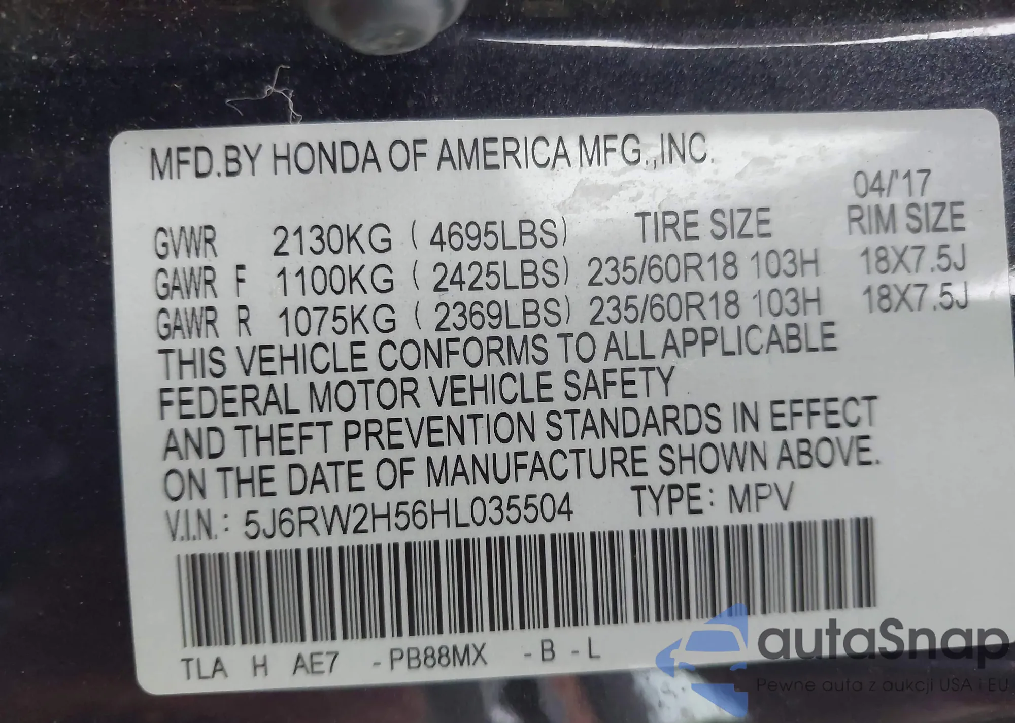 • VIN 2HKRW1H85JH513397