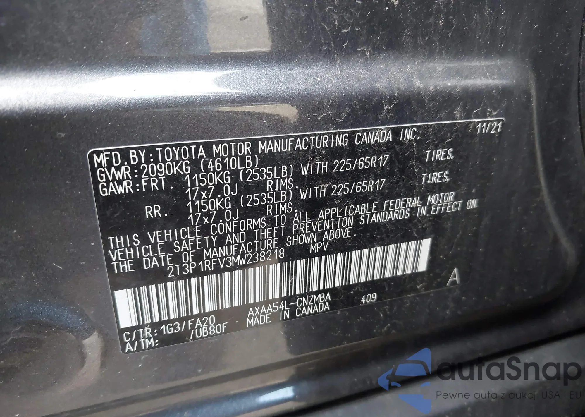 LOT: 42626641 VIN: 2T3P1RFV3MW238218