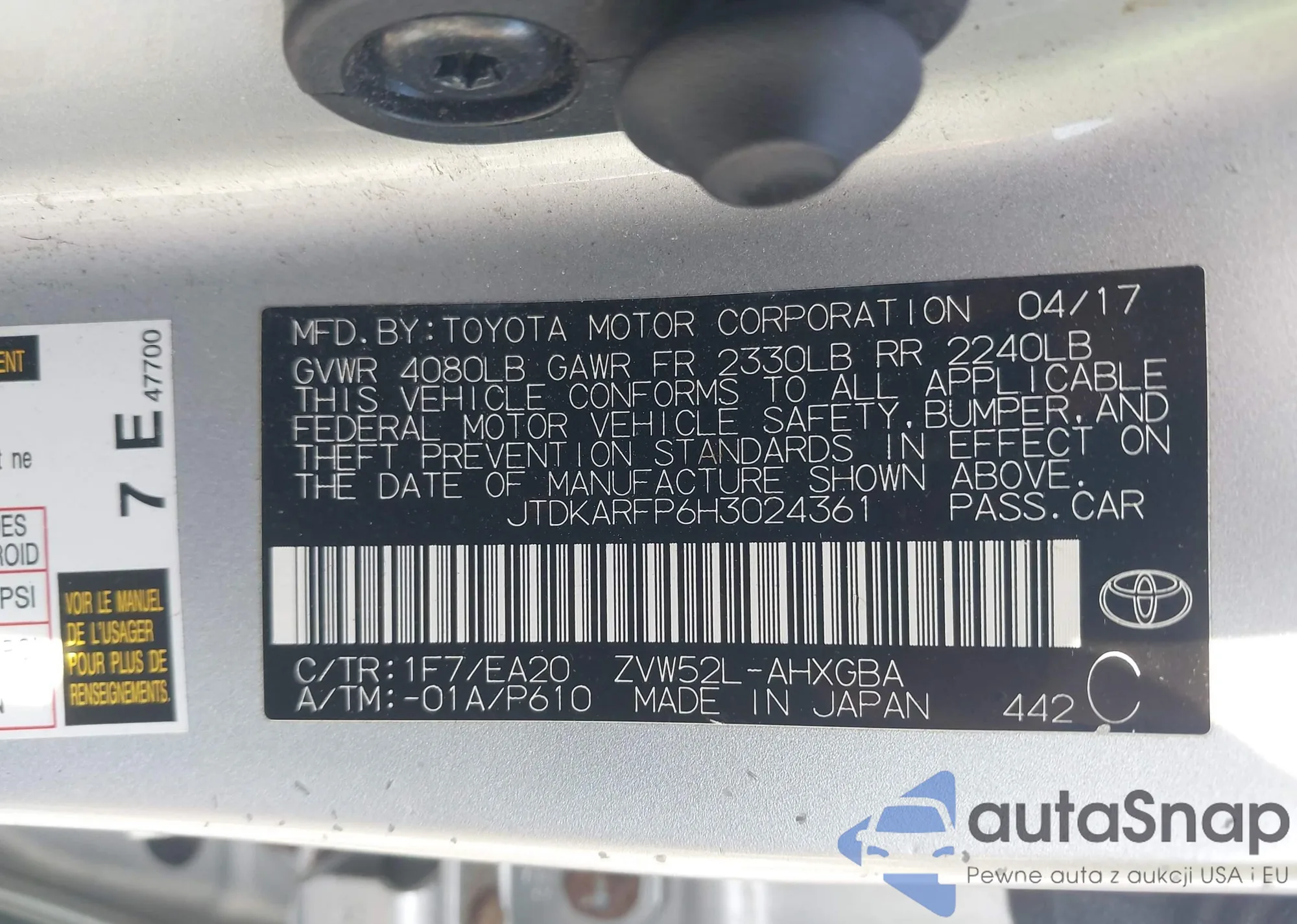 LOT: 42805932 VIN: JTDKARFP6H3024361