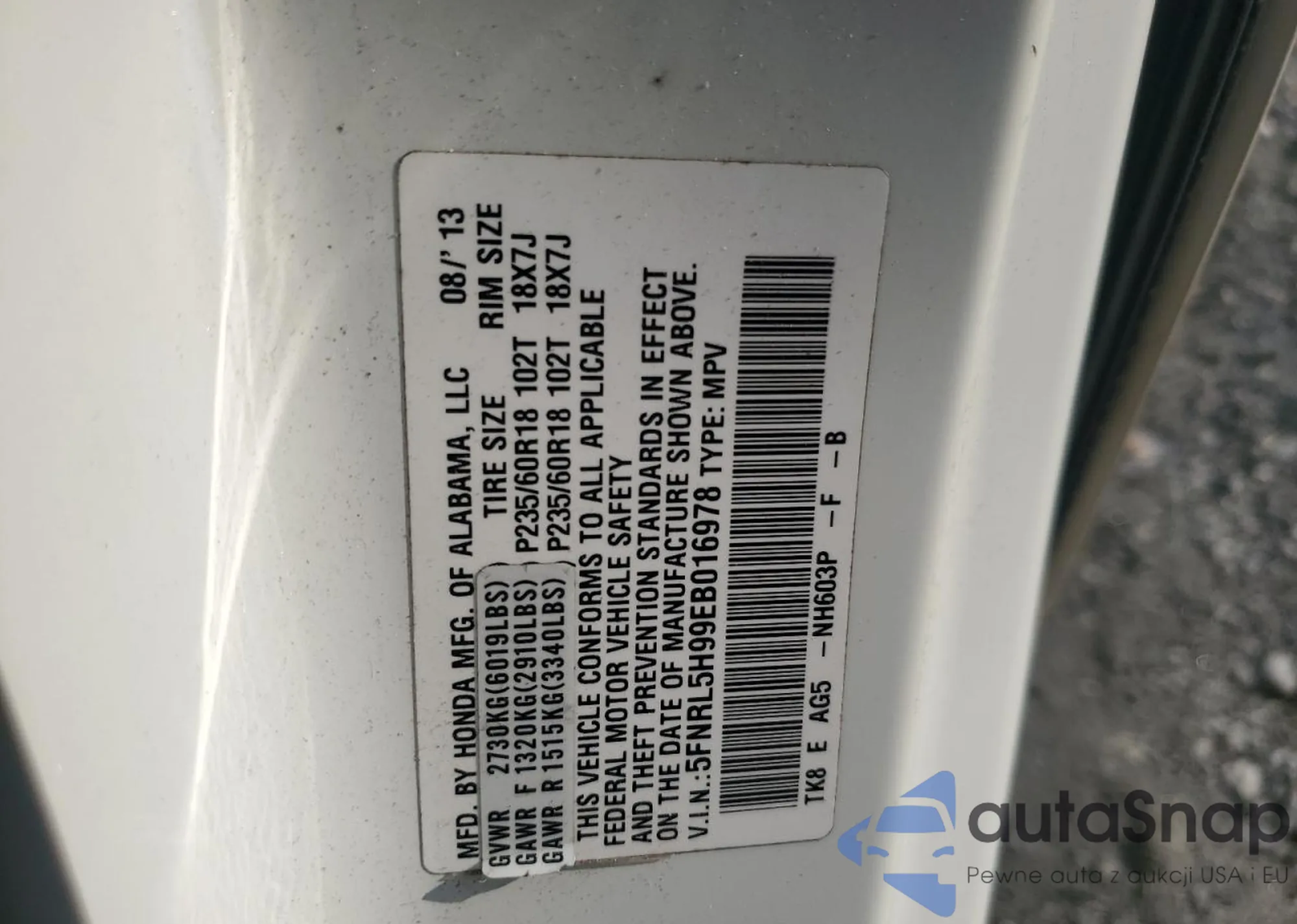LOT: 81310605 VIN: 5FNRL5H99EB016978